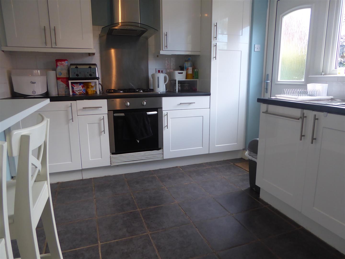 Fitted with a range of white gloss wall, floor and drawer units, work preparation surfaces, stainless steel sink unit, chrome extractor hood, gas hob with chrome splashback, fitted electric oven, integrated fridge, plumbing for an automatic washing machine, ceramic tiled floor, double glazed window and double glazed door opening to the rear aspect.