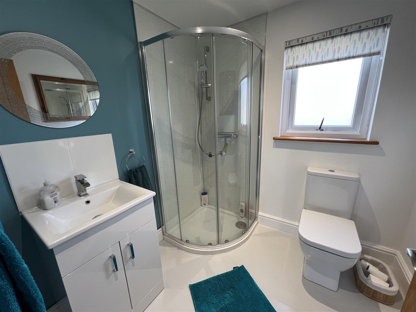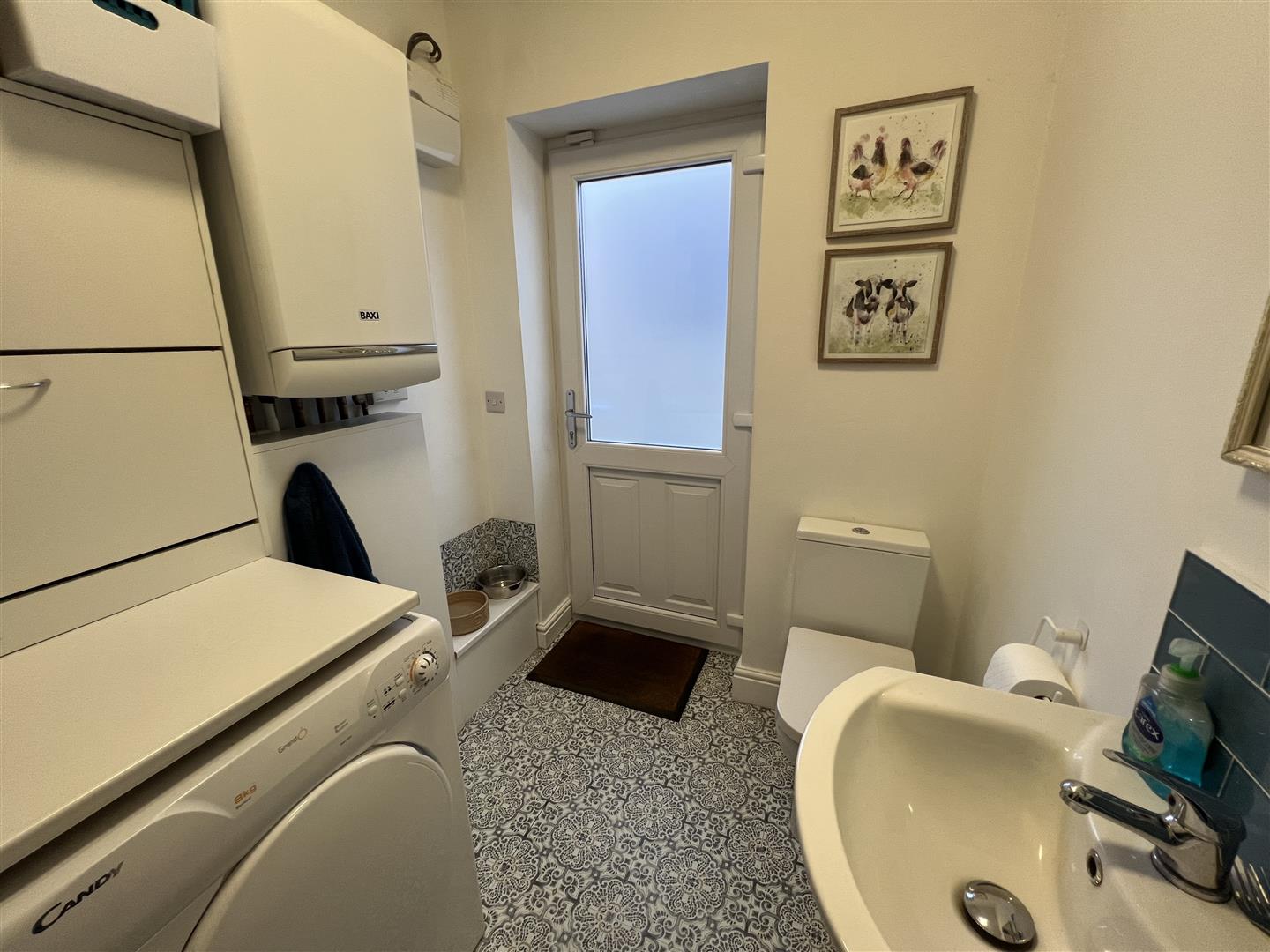 With UPVC door to the side, low level WC and handbasin. There is space for a washing machine and tumble drier and the gas central heating boiler is situated here also.