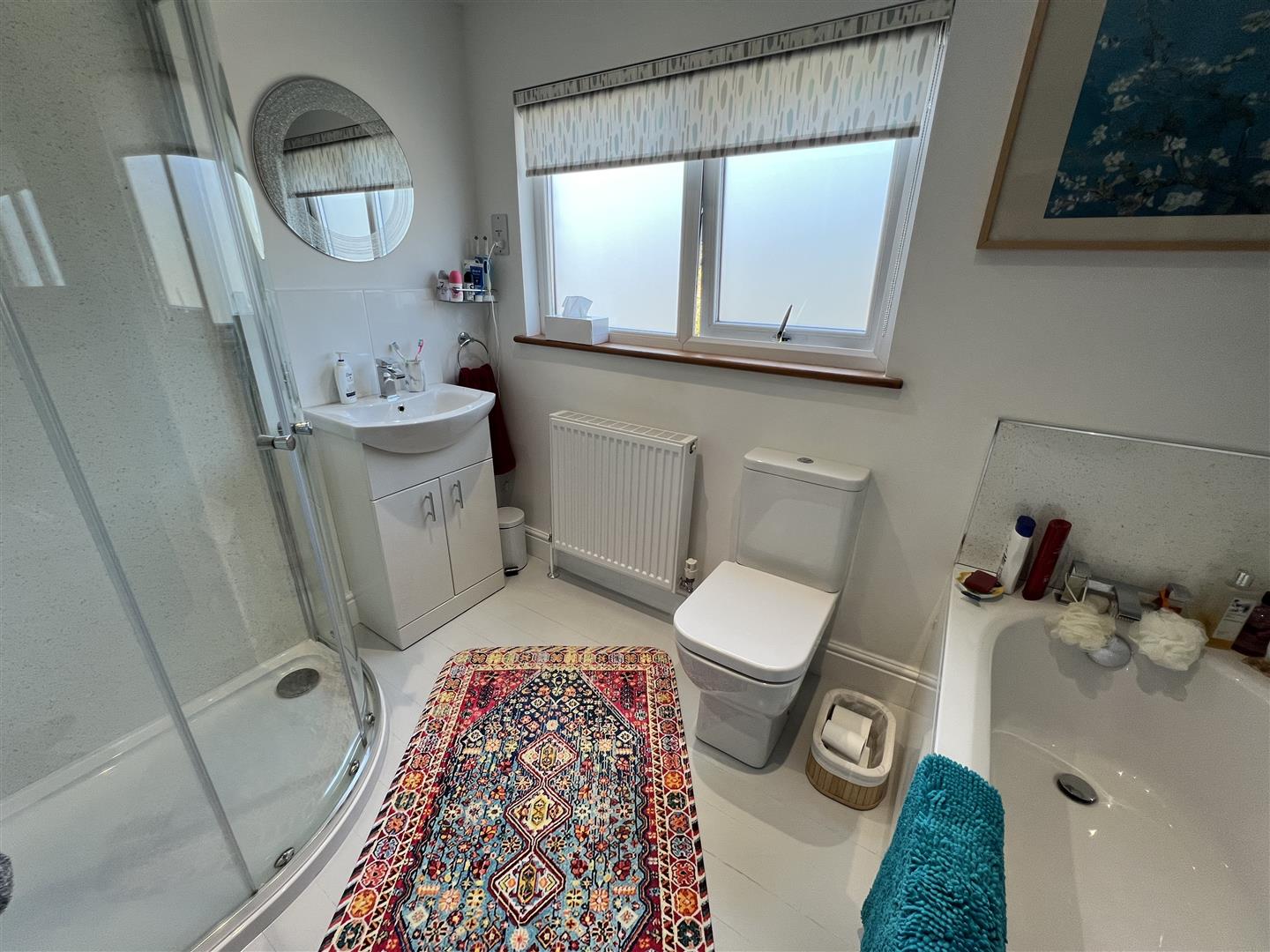 With a panelled bath, shower cubicle, low level WC and handbasin and a window to the rear.