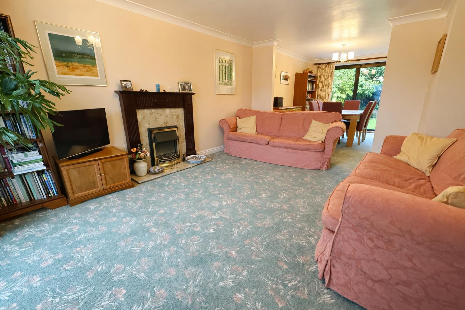 The dining room is a good size and can easily accommodate a family sized dining table and enjoys views to the garden through sliding patio doors.