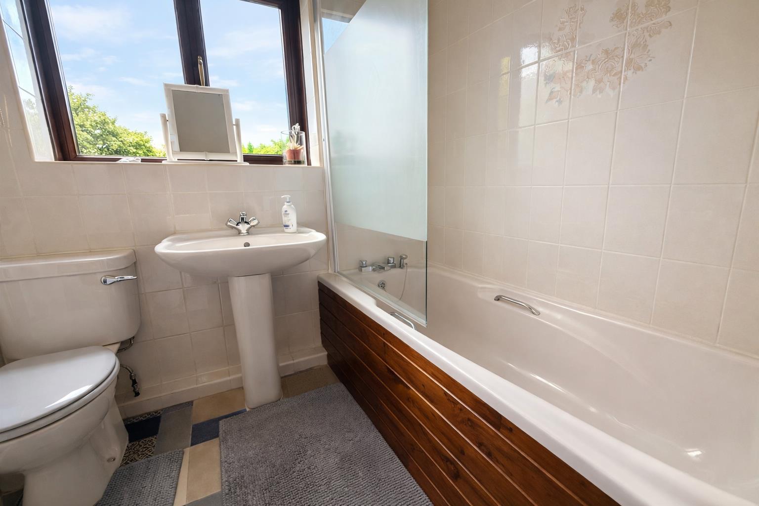 Comprising of a panelled bath with overhead electric shower, pedestal handbasin and WC.