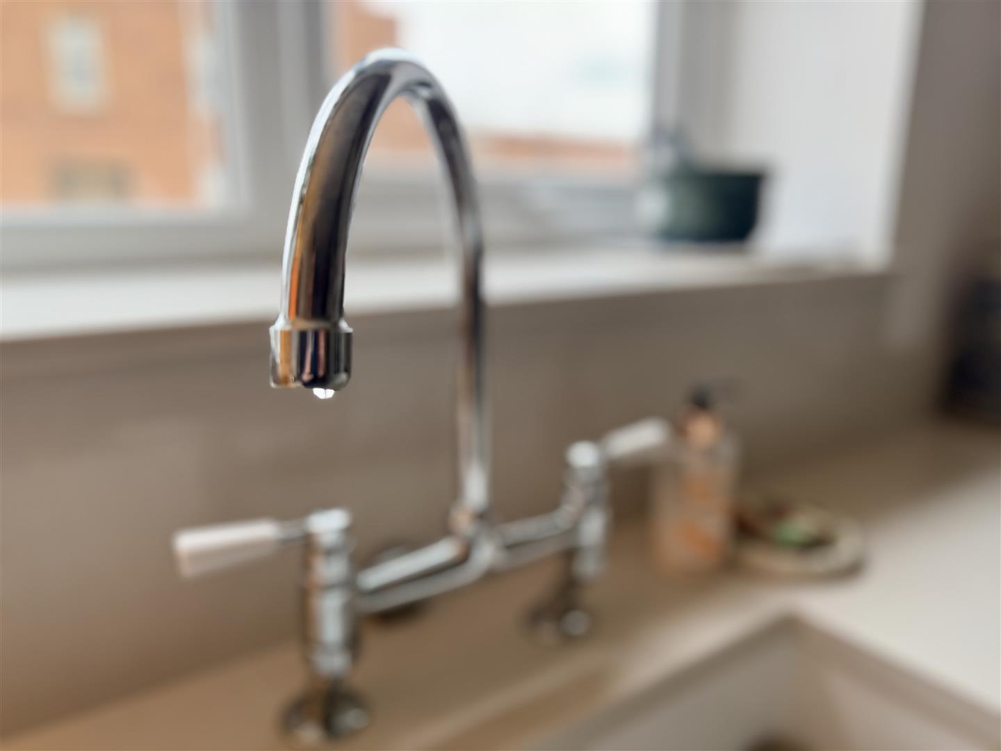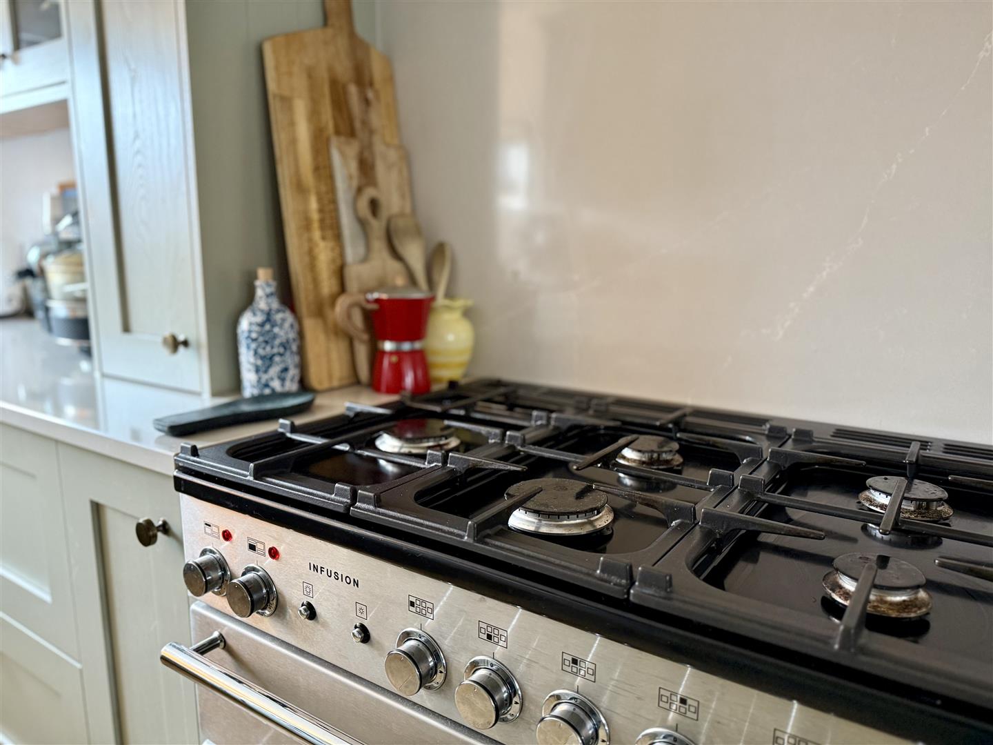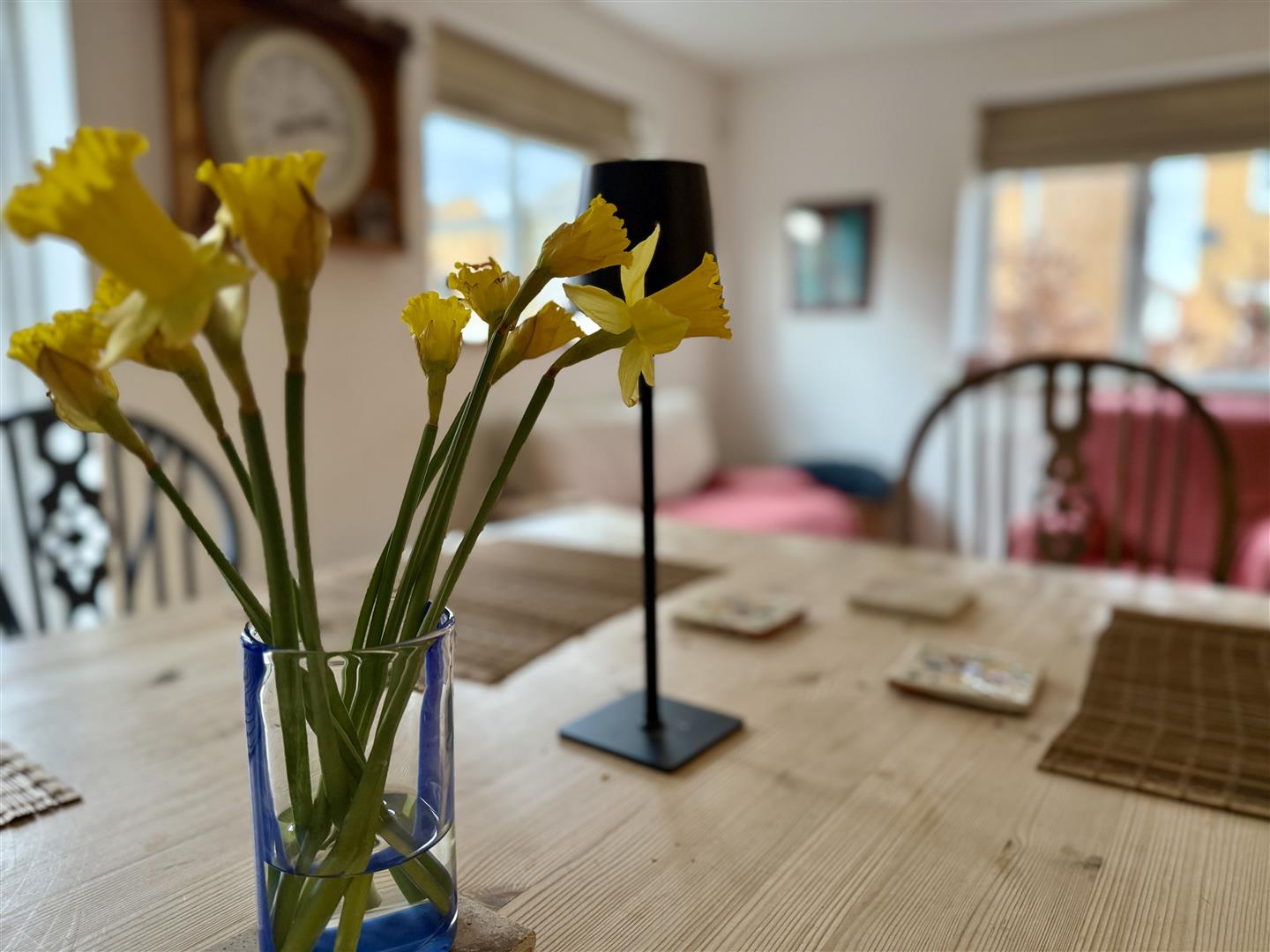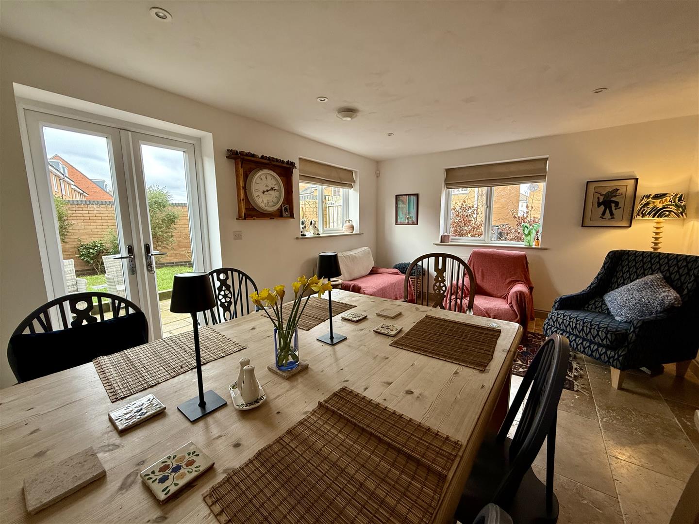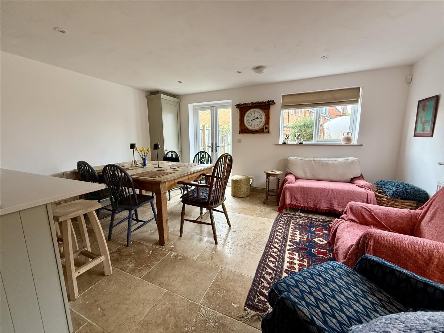 A generous space which easily accommodates a family dining table and soft seating and allows for a great social and entertaining space. There are French doors opening onto the rear garden and a further window to the side so the room is very light and bright.