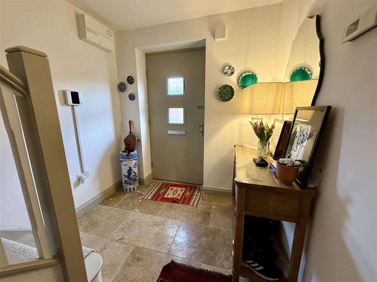 The entrance door opens to the reception hallway which is spacious and welcoming with staircase to the first floor. The travertine floor runs throughout the ground floor and the hallway leads down to the kitchen and dining area.