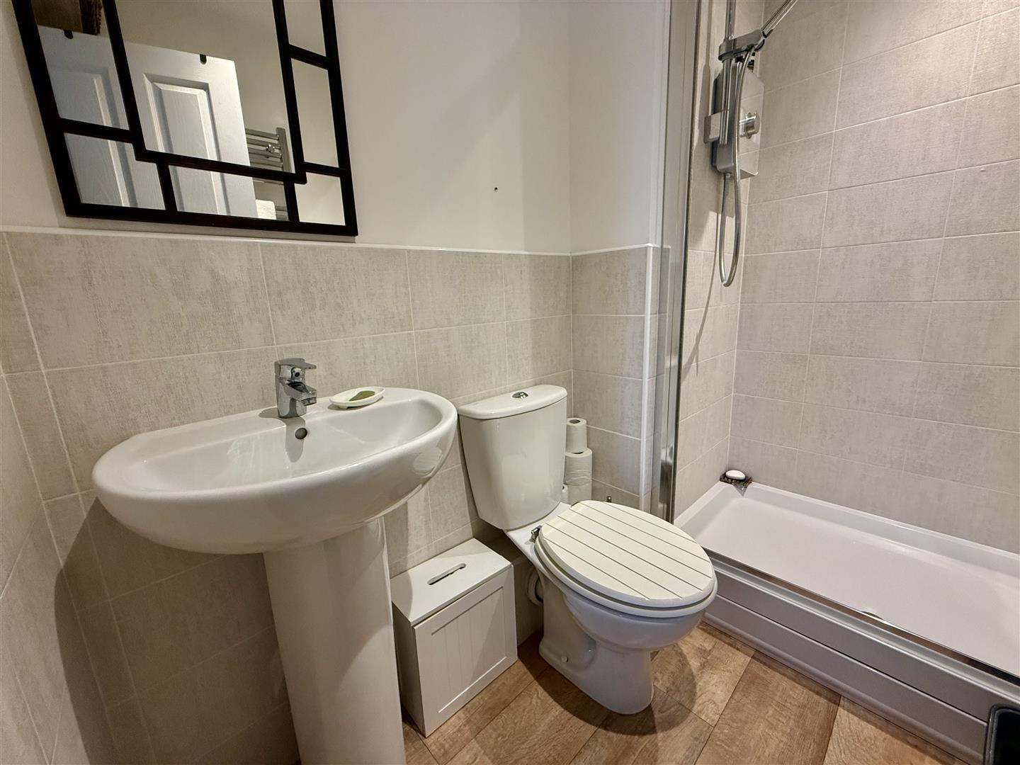 With shower cubicle with mains fed shower, WC and hand basin and again finished with modern ceramics.
