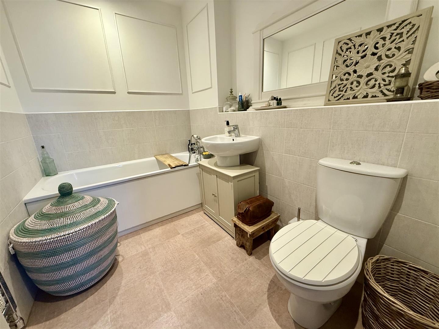 Comprising a white suite with panelled bath, pedestal handbasin and WC. The room has been finished with modern ceramics.