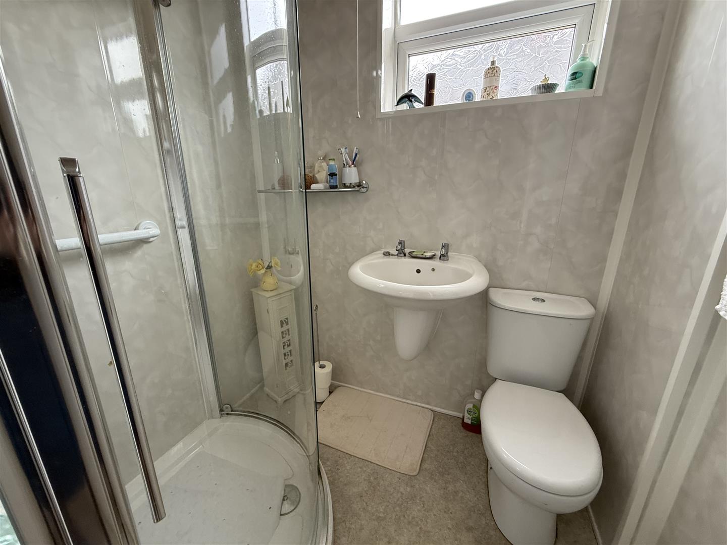 With a corner shower cubicle with electric shower, wall hung hand basin and low level WC. The room has been finished with ceramics and has a window to the side.