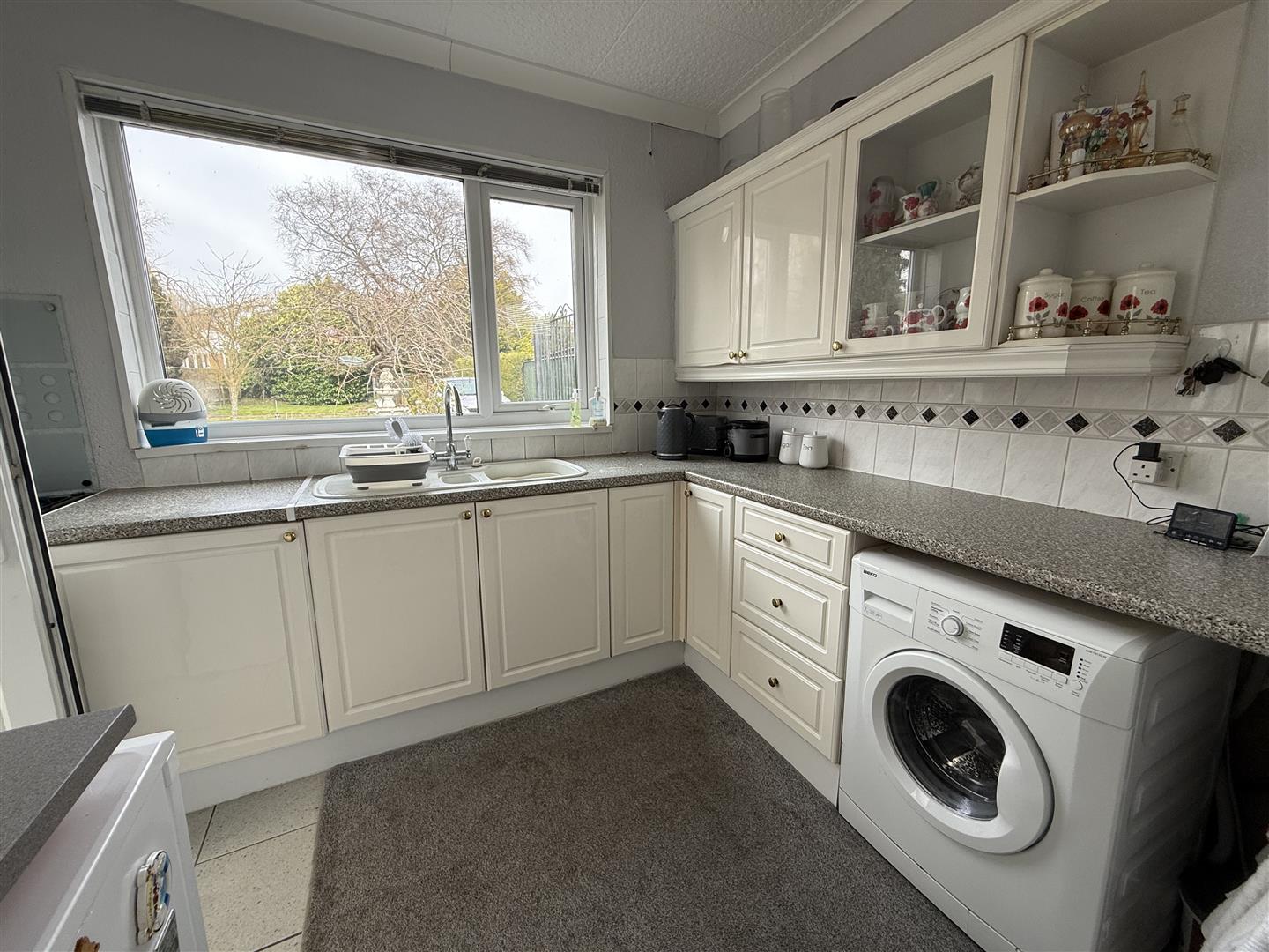 Extended and L shaped the kitchen has been fitted with a range of white gloss cabinets with complementing worksurfaces and textured sink. There is a gas cooker and plumbing for an automatic washing machine. The dining area can easily accommodate a family table and there are windows to the side and rear making it light and bright.