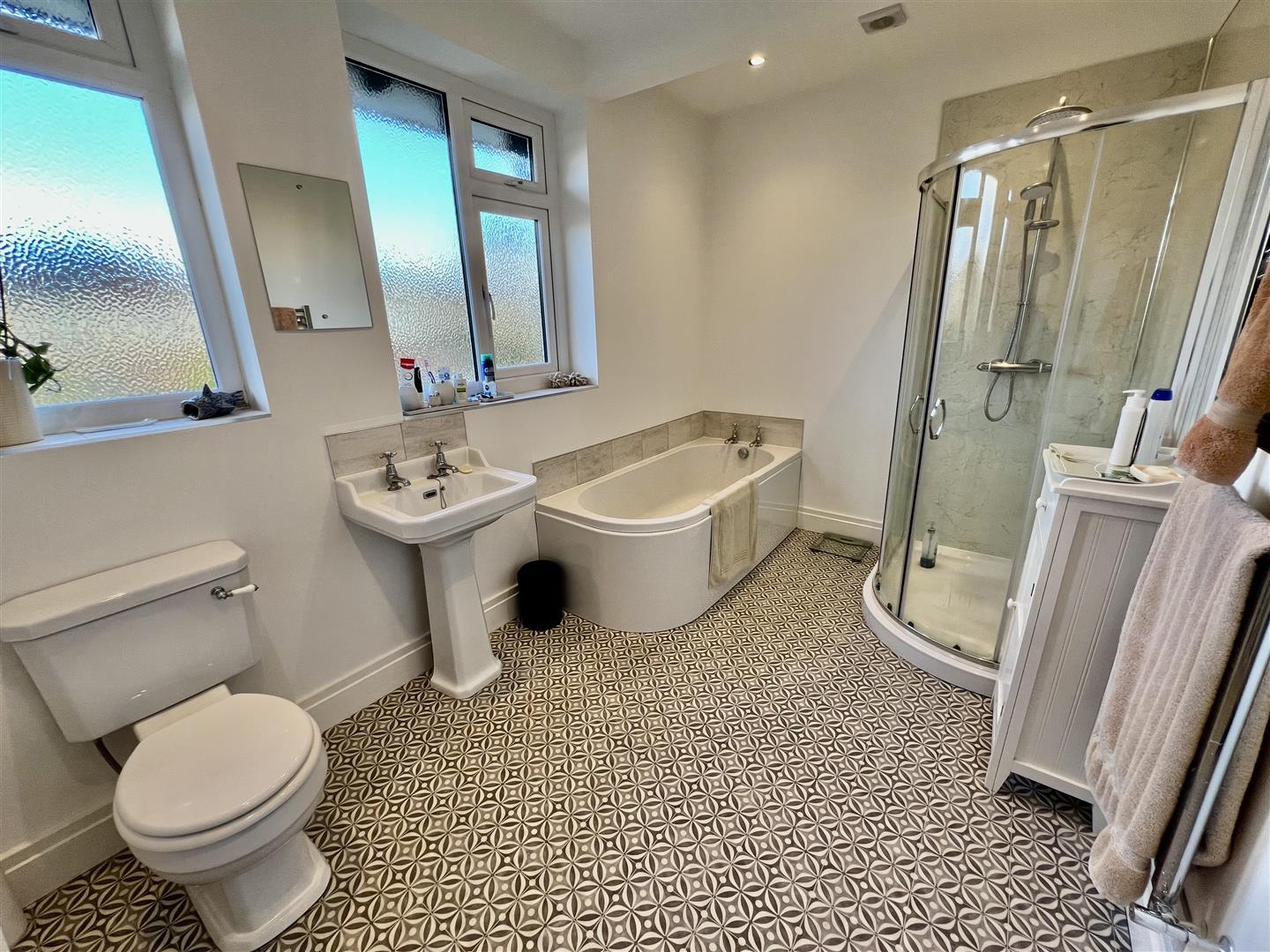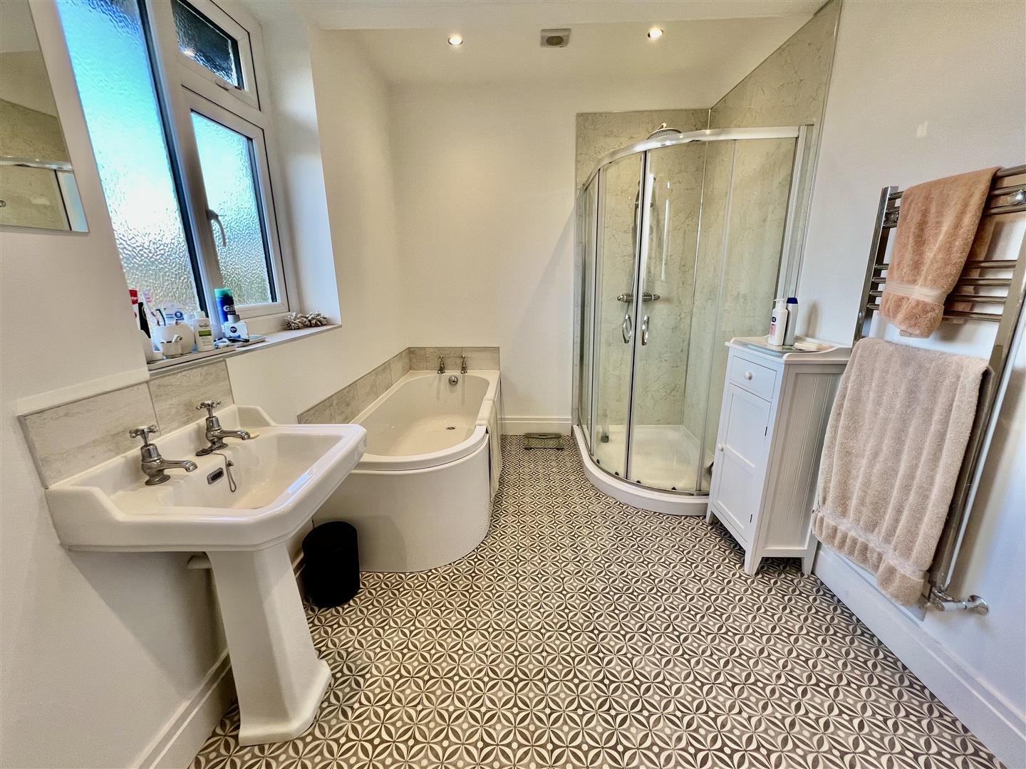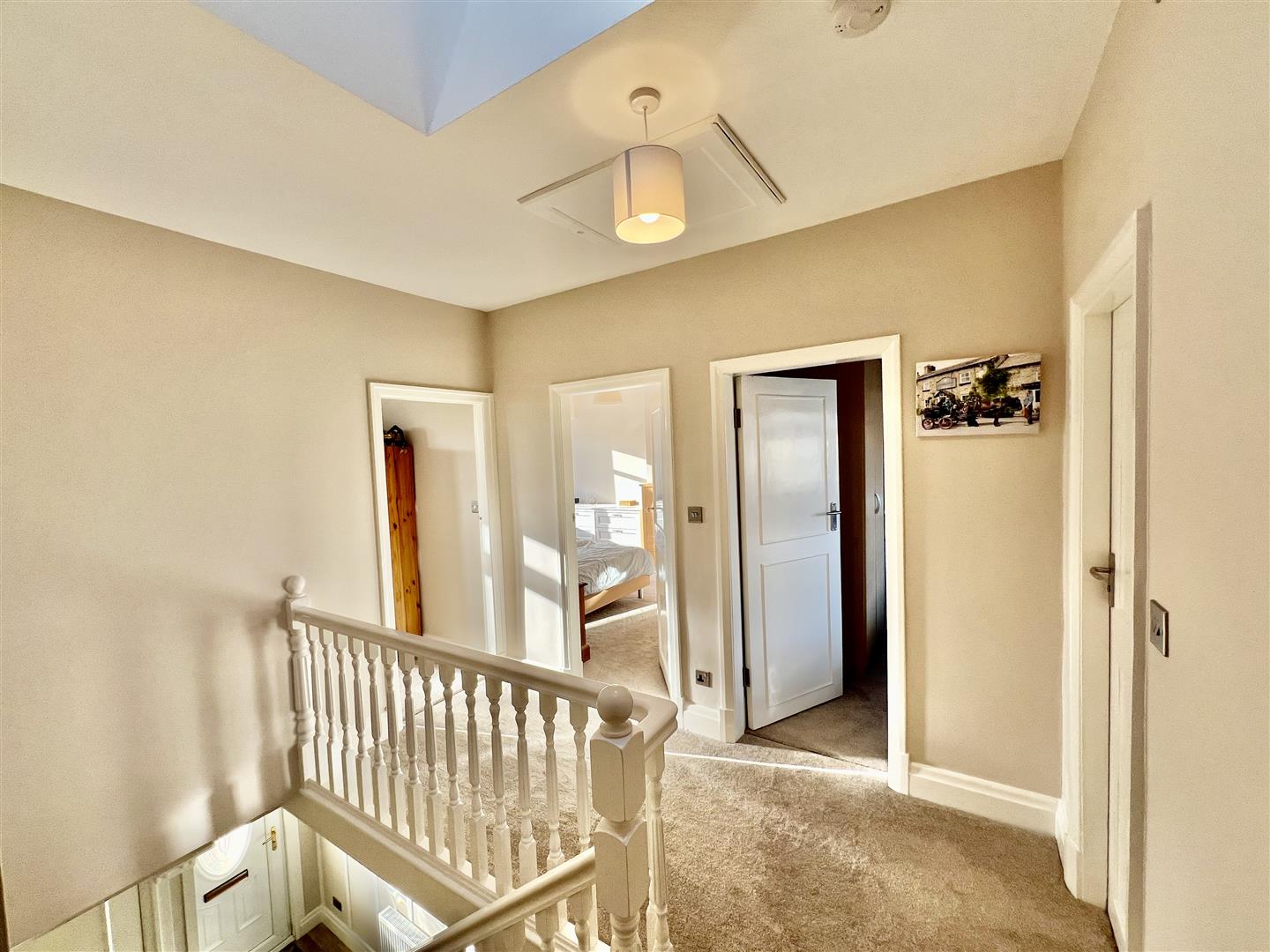 The ground floor also features a separate front lounge, providing a cosy retreat, along with a convenient WC. Upstairs, four well-proportioned bedrooms are complemented by a stylish family bathroom and a separate shower room. A standout feature is Bedroom Three, which benefits from sliding doors opening onto a private balcony offering stunning views over the park.
