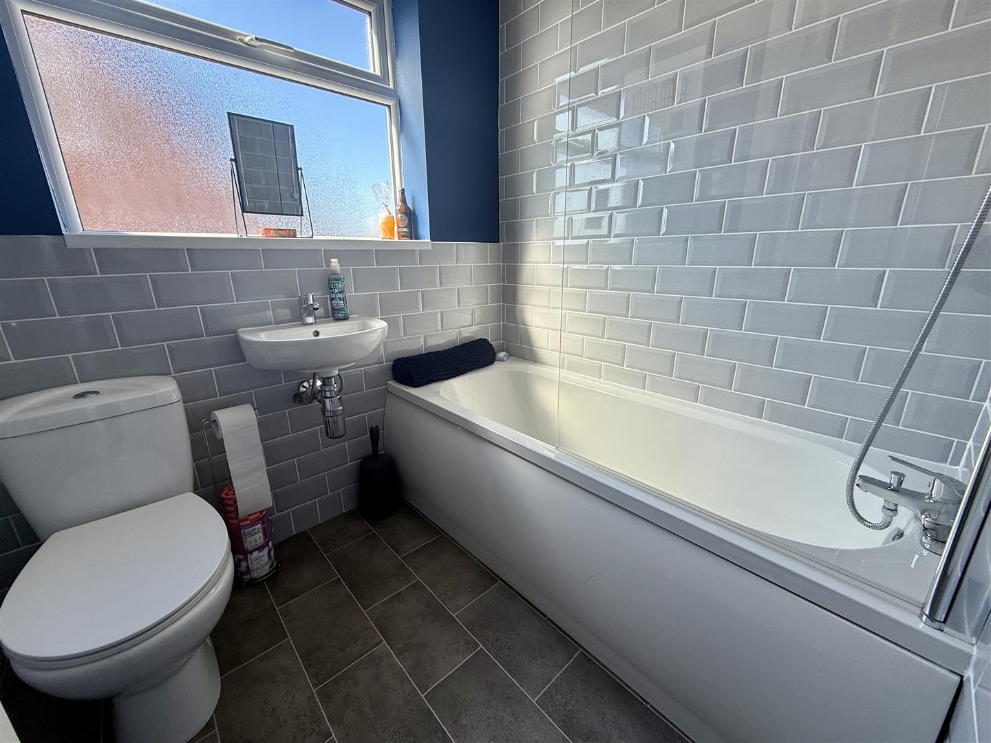 Upgraded and comprising of a white suite with panelled bath with chrome hand held shower mixer, pedestal handbasin and WC.