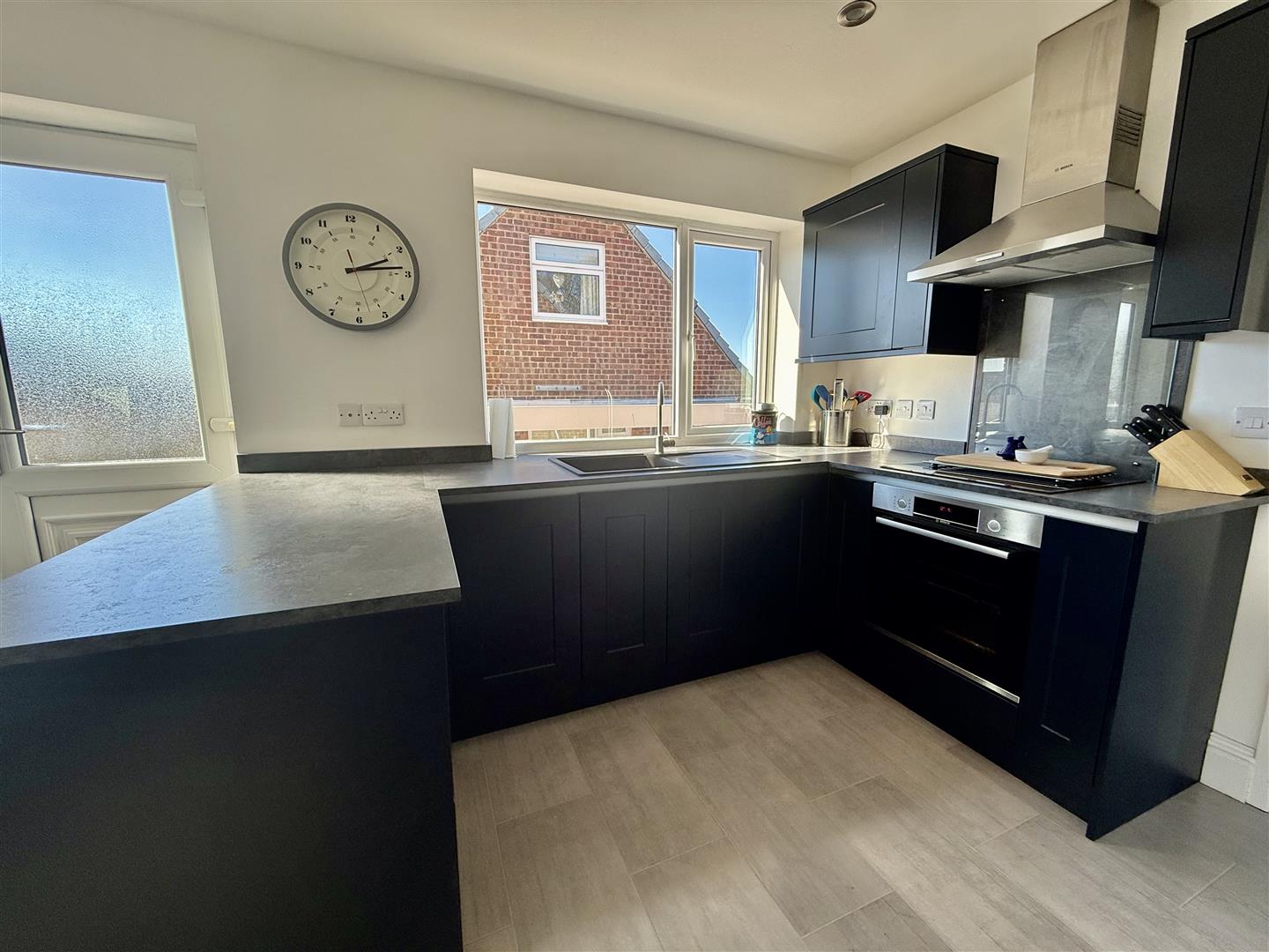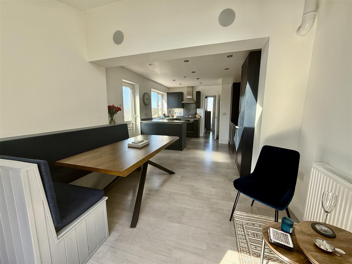 The kitchen and dining area has been extended and has French doors and a velux window to the rear to through light around the dining area to the rear which has built in bench seating to the space. The kitchen area has been fitted with an ample range of modern cabinets in a blue tone with complimenting worksurfaces with stainless steel sink unit. The integrated appliances include an electric oven and induction hob, fridge/freezer and washing machine. The room has a window to the front aspect and a practical laminate floor.