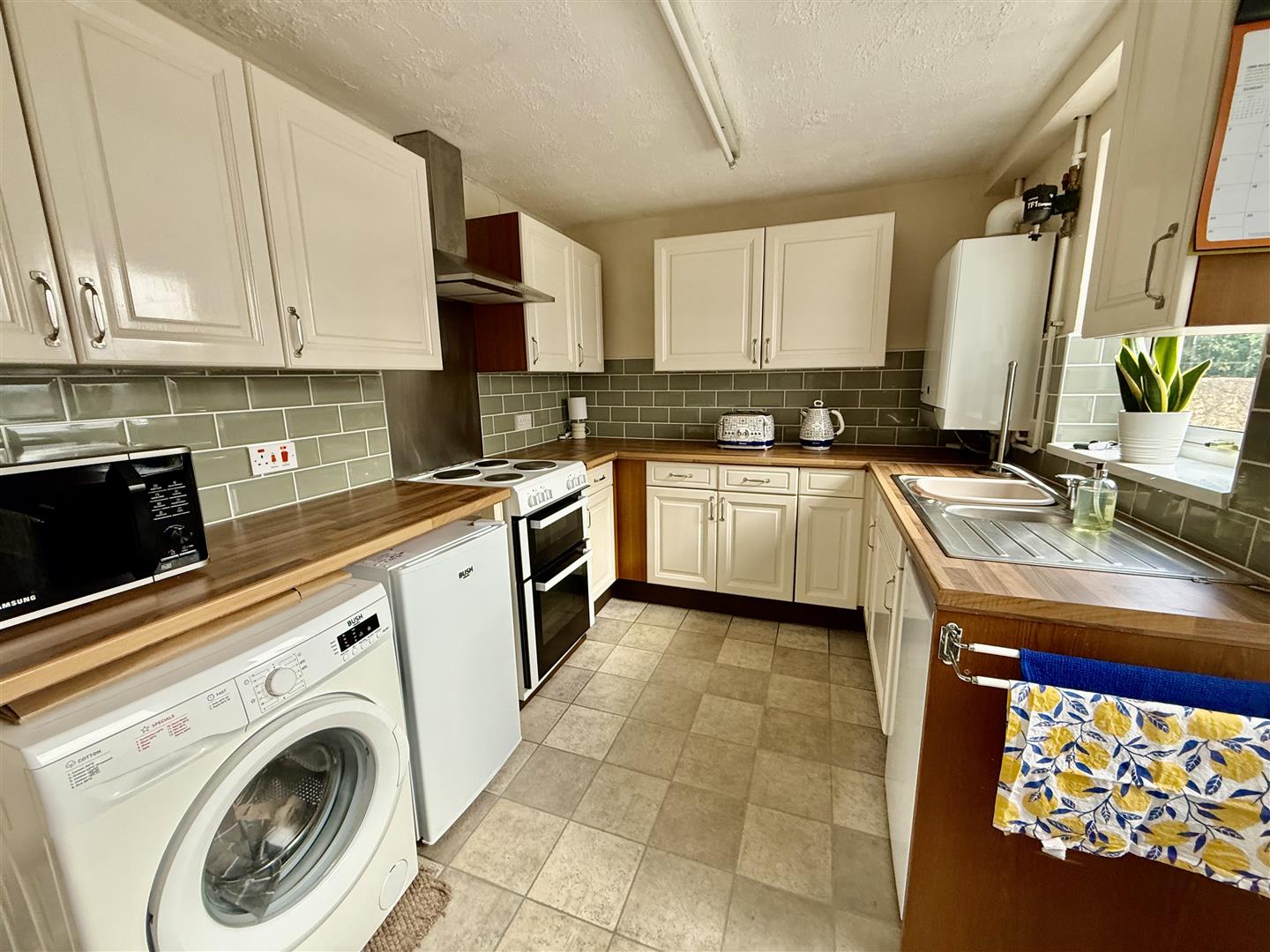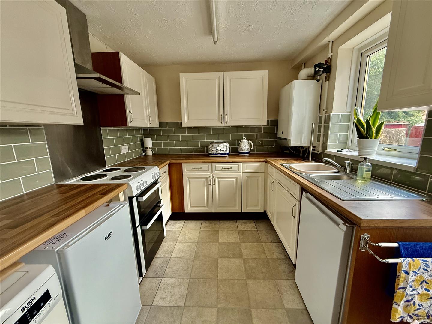 The kitchen comprises an ample range of cream, wall, floor and drawer cabinets which are complemented by the warm tones of the wood effect worksurfaces. The free standing electric cooker is included in the sale and there is plumbing for an automatic washing machine. The kitchen has a window and door to the side.
