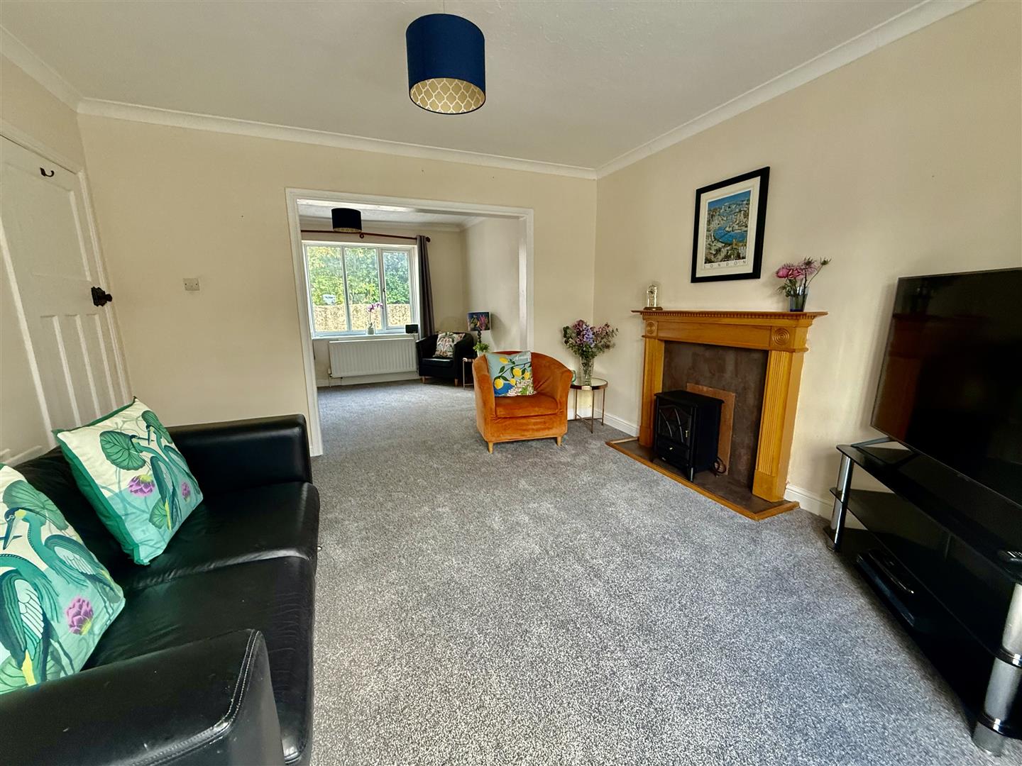 A generous reception room with a bay window to the front aspect there is a wooden feature fireplace providing a focal point and the room is open plan to the dining area.