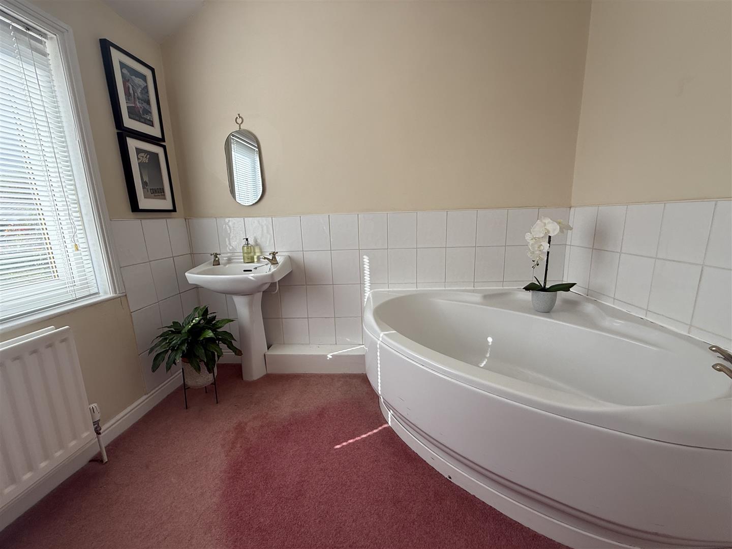 With a large corner bath and pedestal handbasin. The bathroom overlooks the front aspect.