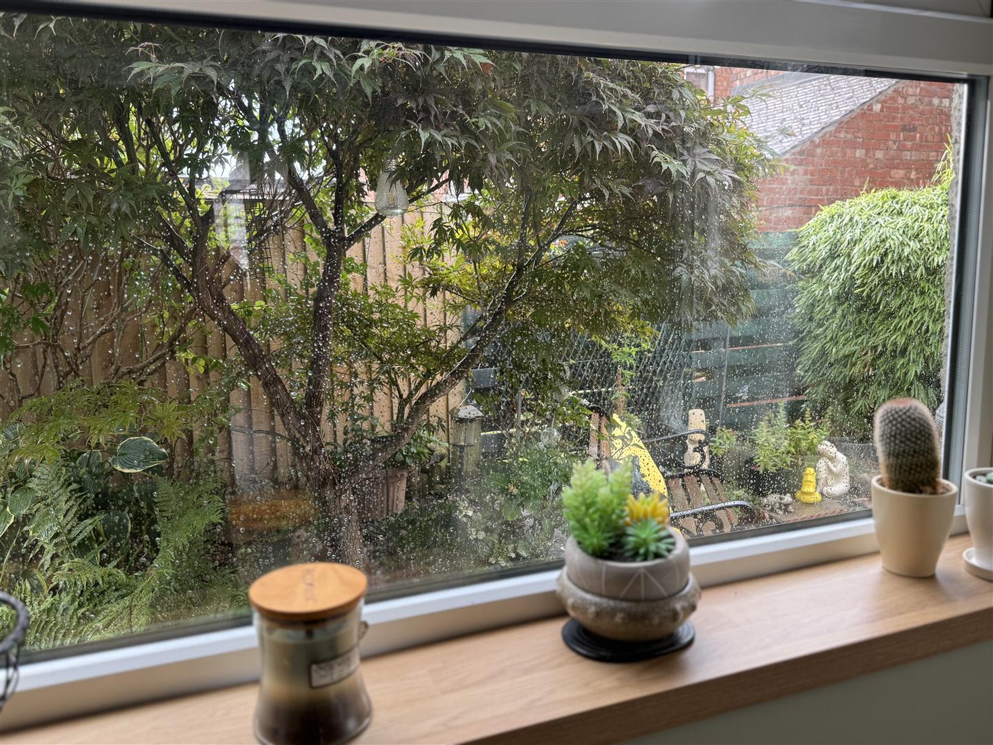 The kitchen has been refitted galley style with an ample range of Cream cabinets with the warm tones of the light oak effect worksurfaces complementing them perfectly. The integrated appliances include an electric oven and hob, washing machine and fridge freezer. The room has a large window which captures all of the colour and interest of the courtyard and a door leading out to the side.