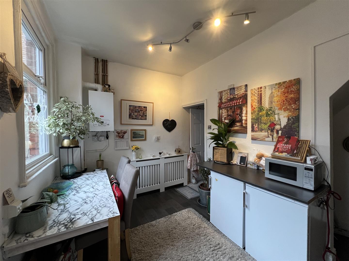 A welcoming reception room with a walk in bay window to the front aspect and the original storage cupboard and drawers to the chimney breast. There is a brick feature fireplace with a tiled hearth to add a focal point to the room. A door leads through to the staircase and the kitchen/diner.