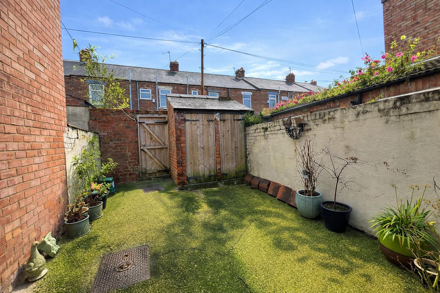 There is a forecourt to the front and an enclosed courtyard to the rear with brick built outhouses for storage. A single gate provides access to the rear service lane.