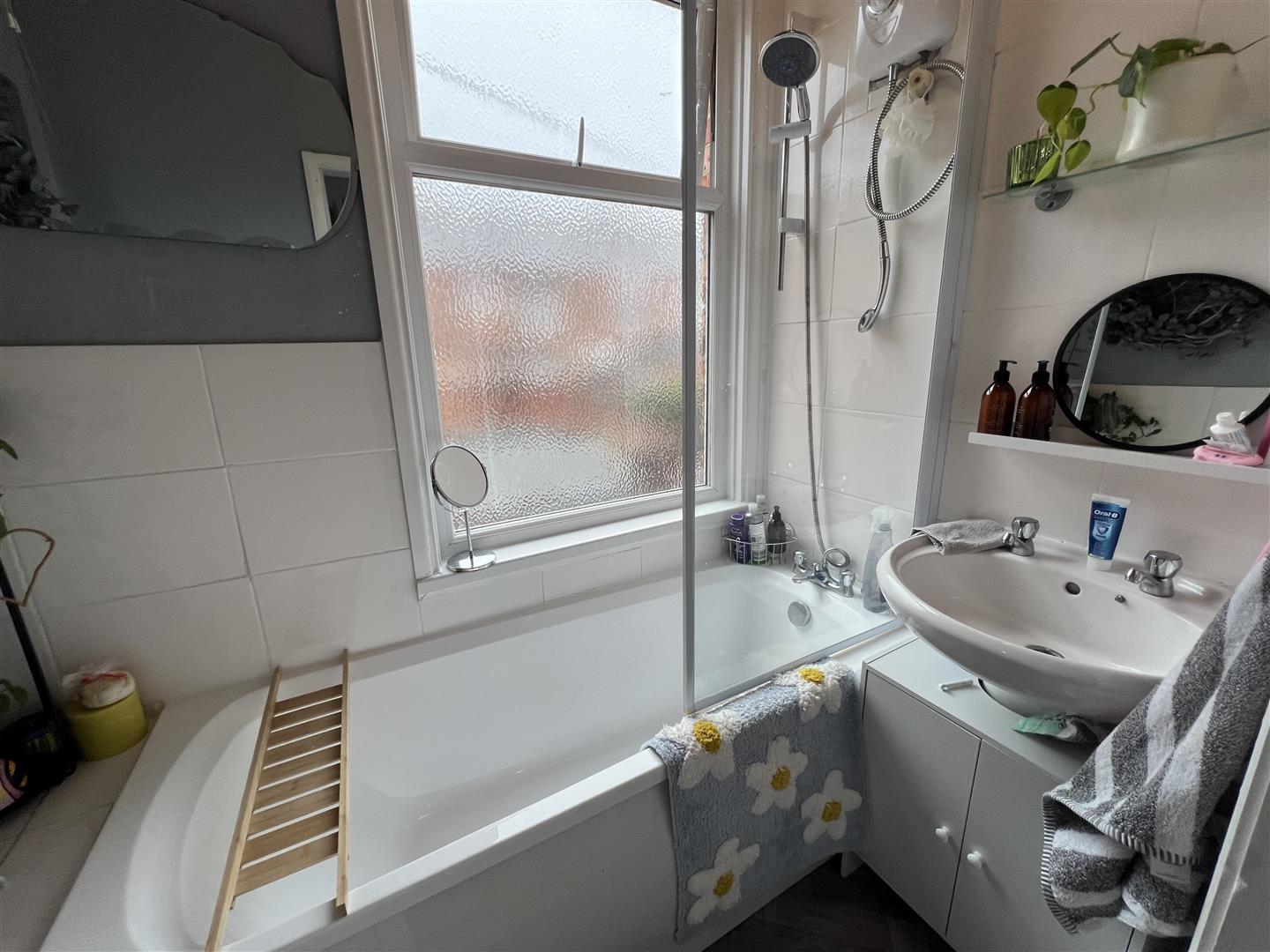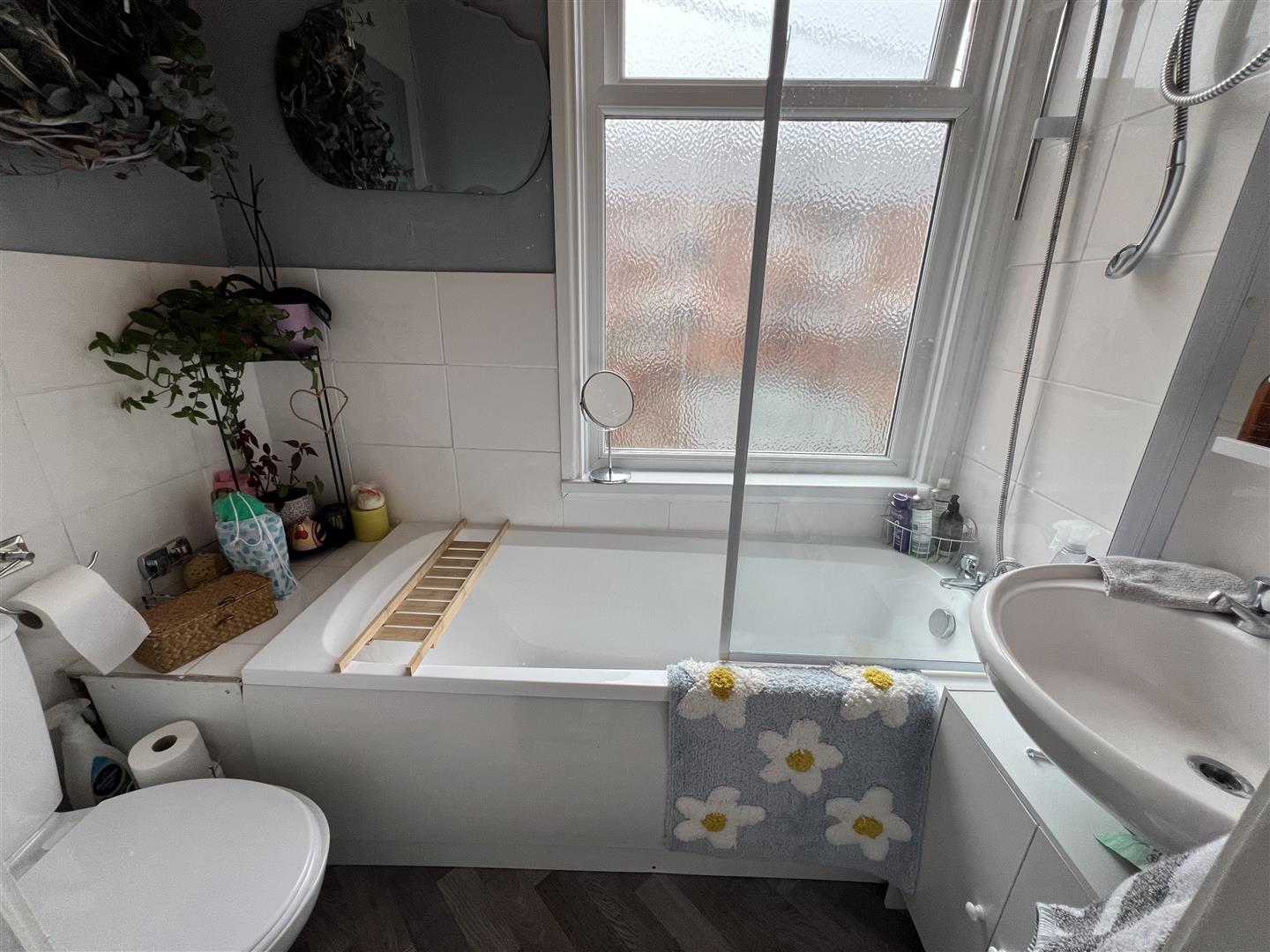 Comprising a white suite with panelled bath with chrome shower mixer, handbasin and WC. The room is tiled and has window to the rear aspect.