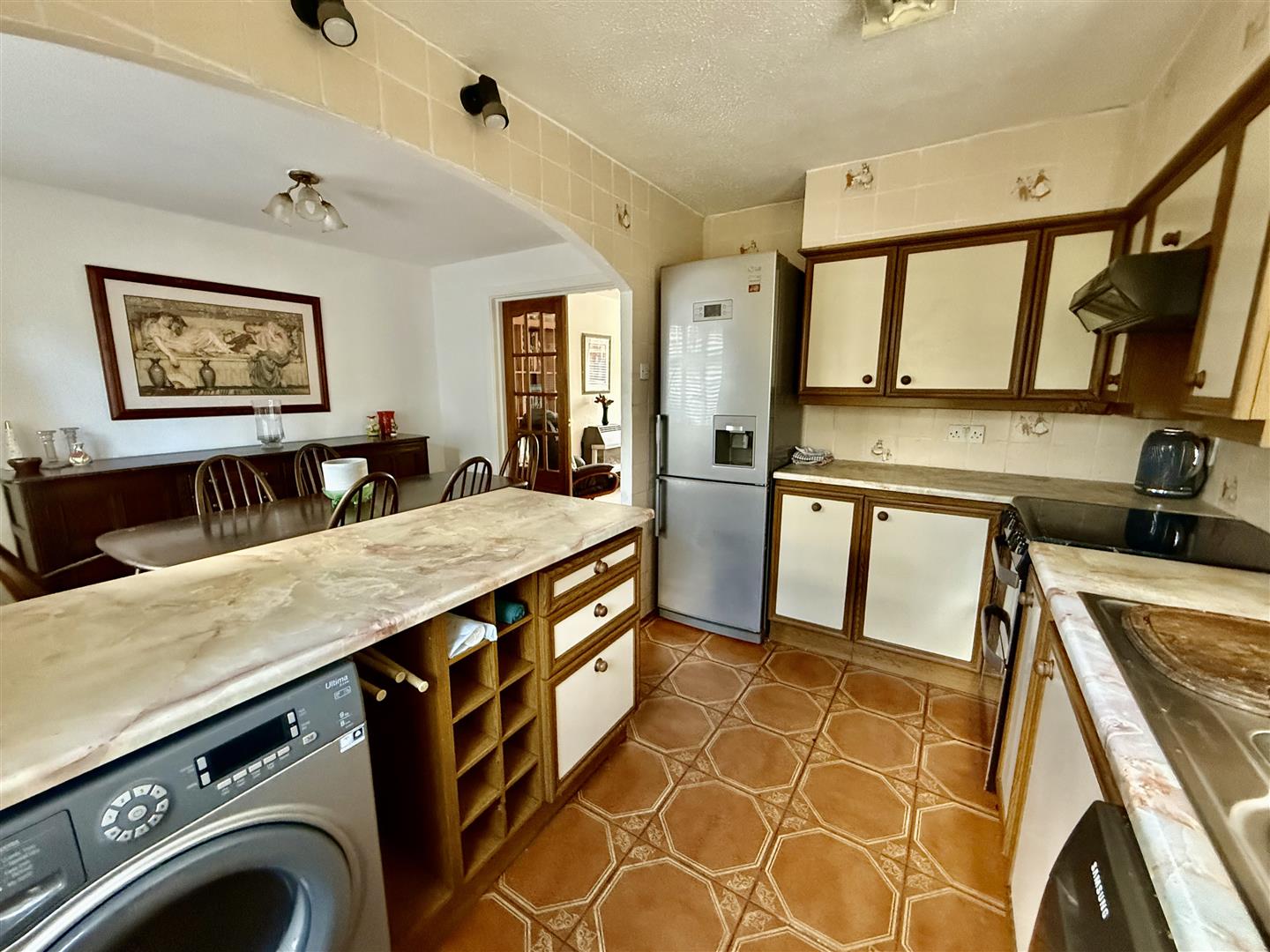 A sizeable open plan space with a range of cabinets with work surfaces and stainless steel sink unit. There is plumbing for an automatic washing machine and the integrated appliances include and electric oven and hob. There is a breakfast bar that splits the room and the dining area can easily accommodate a family dining table. There are windows to the rear and a door leading out to the garden.