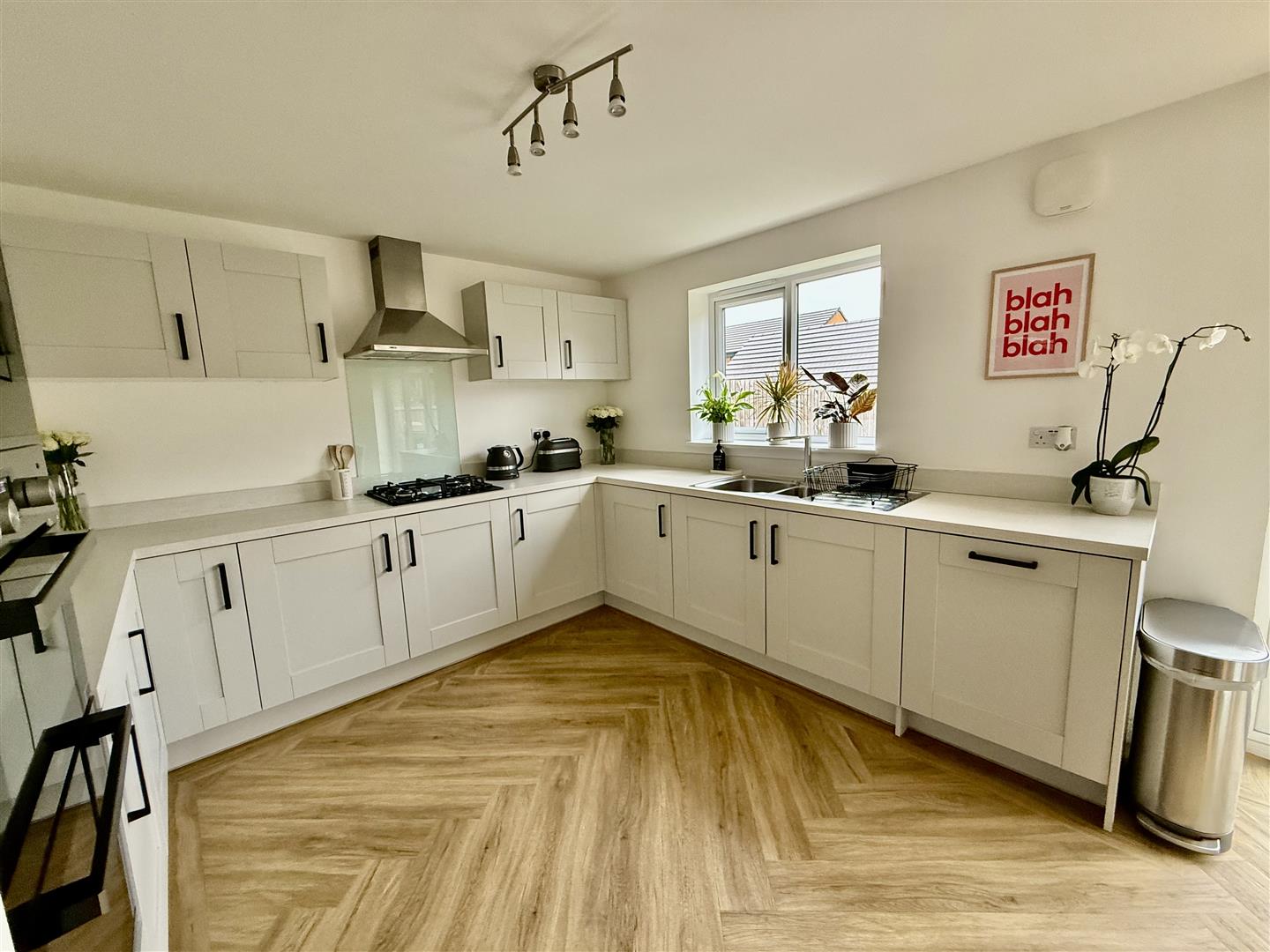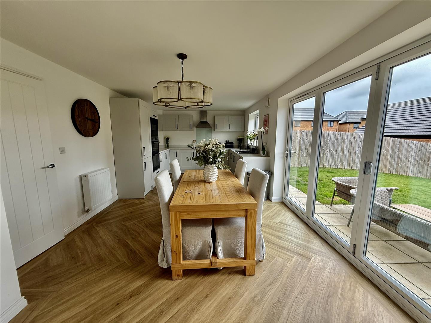 The sizeable open plan kitchen and dining area is a pleasant room flooded with light via the bi-fold doors. The kitchen comprises a range of modern Grey cabinets with complementing worksurfaces and the integarted appliances include an electric double oven and gas hob, microwave and dishwasher. There is access to a handy utility room.
