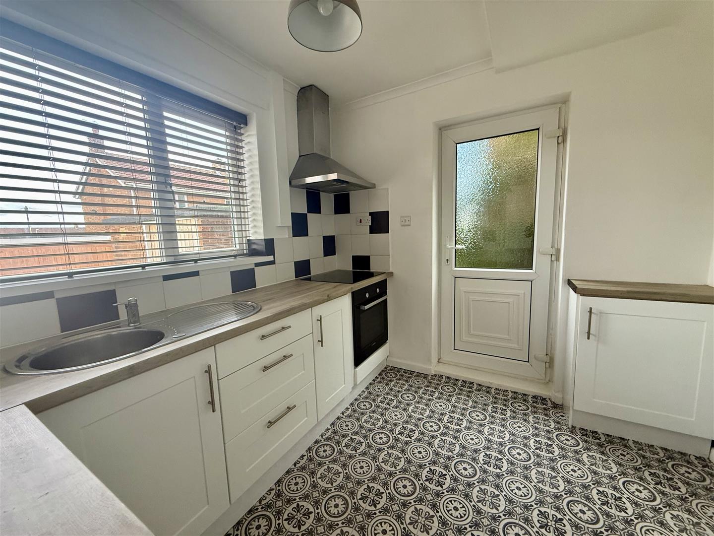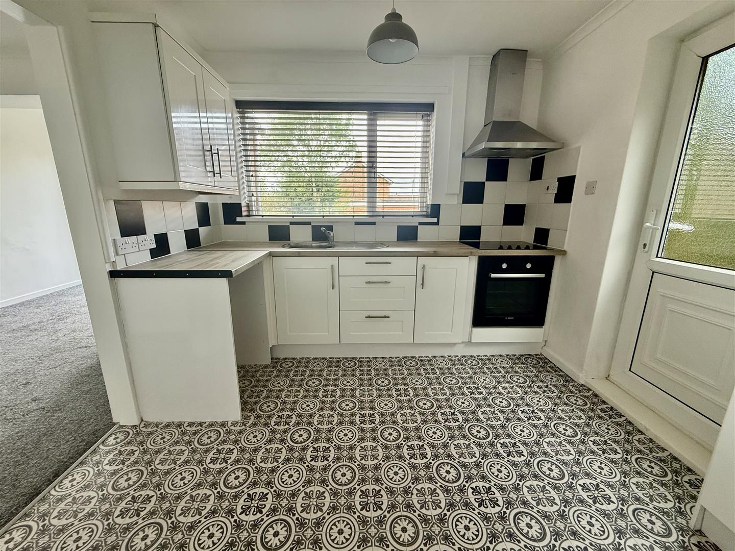 The kitchen comprises of an ample range of white gloss cabinets with wood effect worksurfaces and stainless steel sink unit. The integrated appliances include an electric oven and hob. The room is finished with tiled surrounds and there is plumbing for an automatic washing machine and a window to the rear and a door to the side.