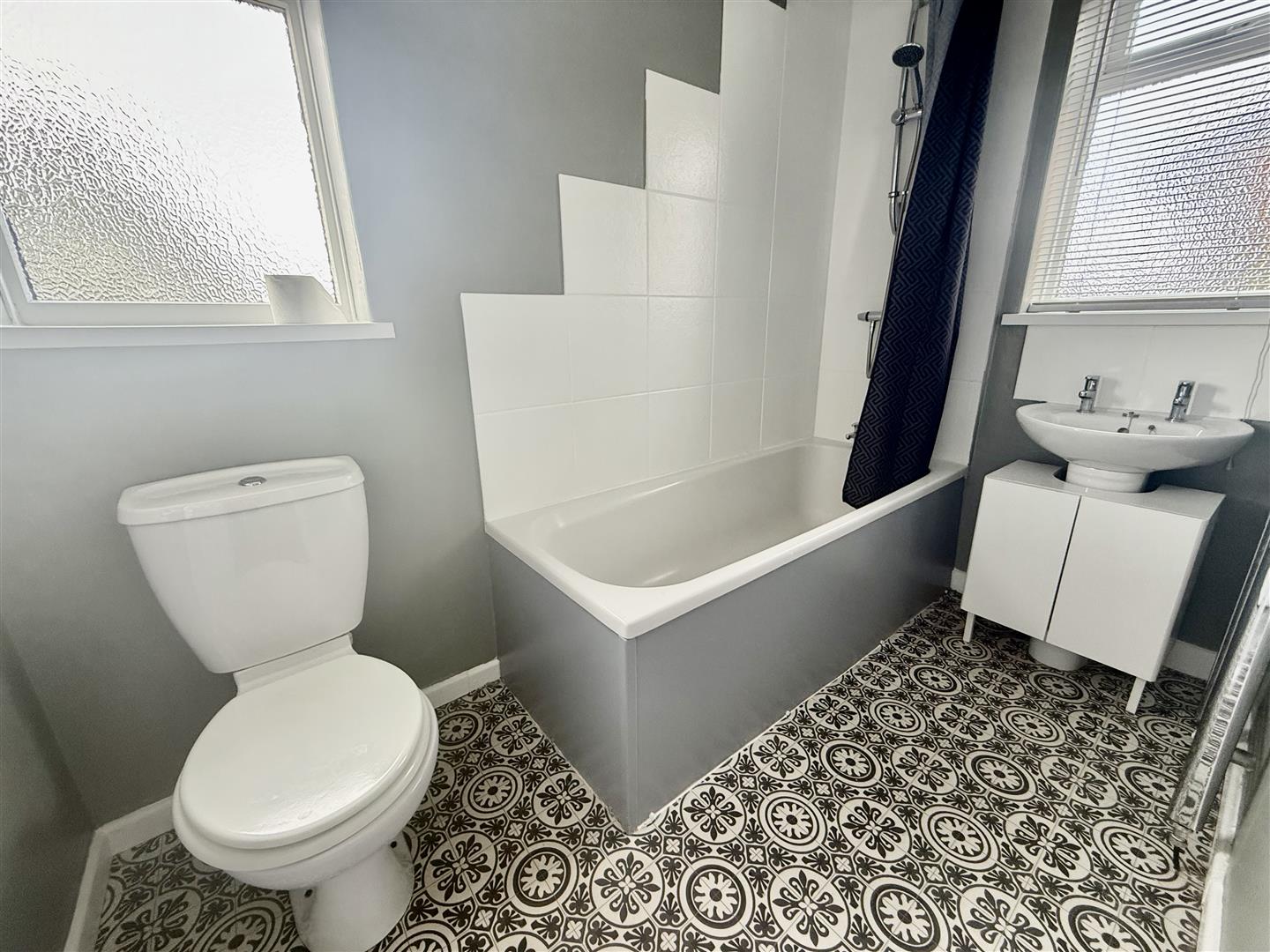 Fitted with a white suite to include a panelled bath with mainsfed over the bath shower, pedestal handbasin and WC there is also a chrome heated towel rail.