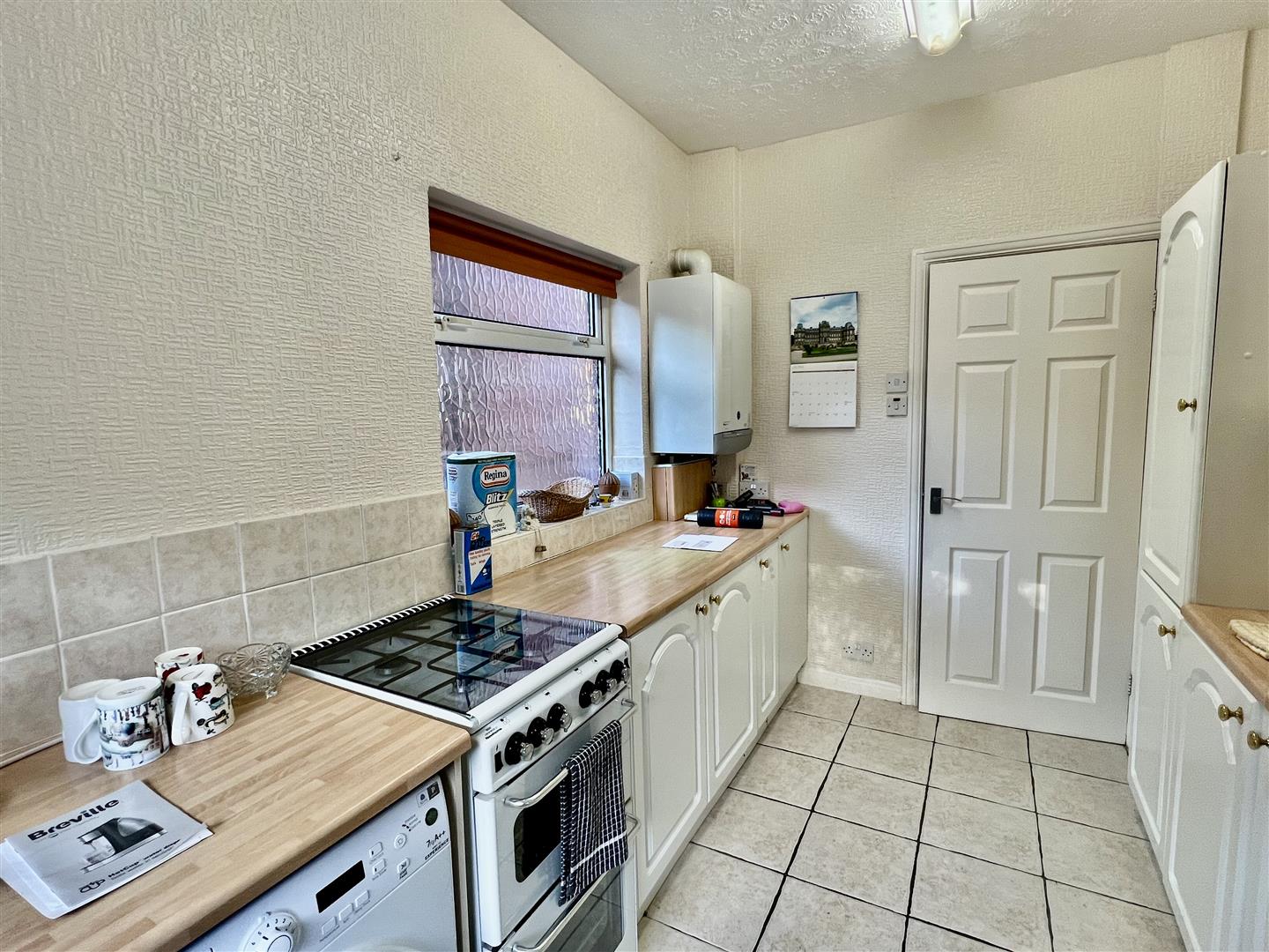 Fitted galley style with a range of cream cabinets and complementing work surfaces with a stainless steel sink unit. There is a freestanding gas cooker, fridge and washing machine are included in the sale. The room has been finished with tiled surrounds and has a window to the side and rear.