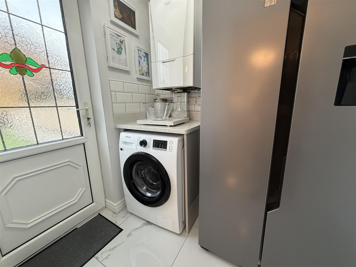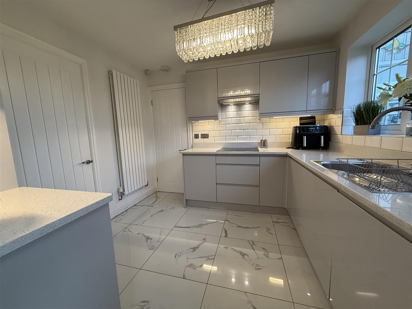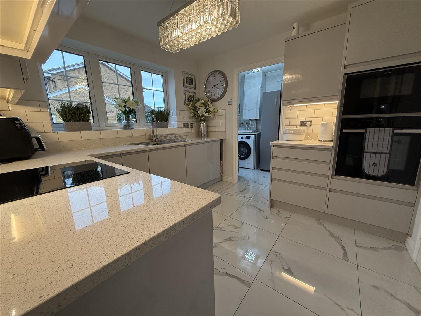 Upgraded and refitted with a modern range of gloss cabinets with the striking granite worksurfaces complimenting them perfectly. The integrated appliances include an electric oven, hob and microwave and dishwasher. The room has a window to the rear and is finished with a marble effect tiled floor. A door leads through to the utility room.