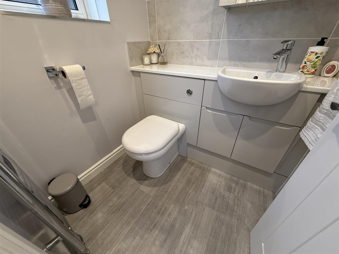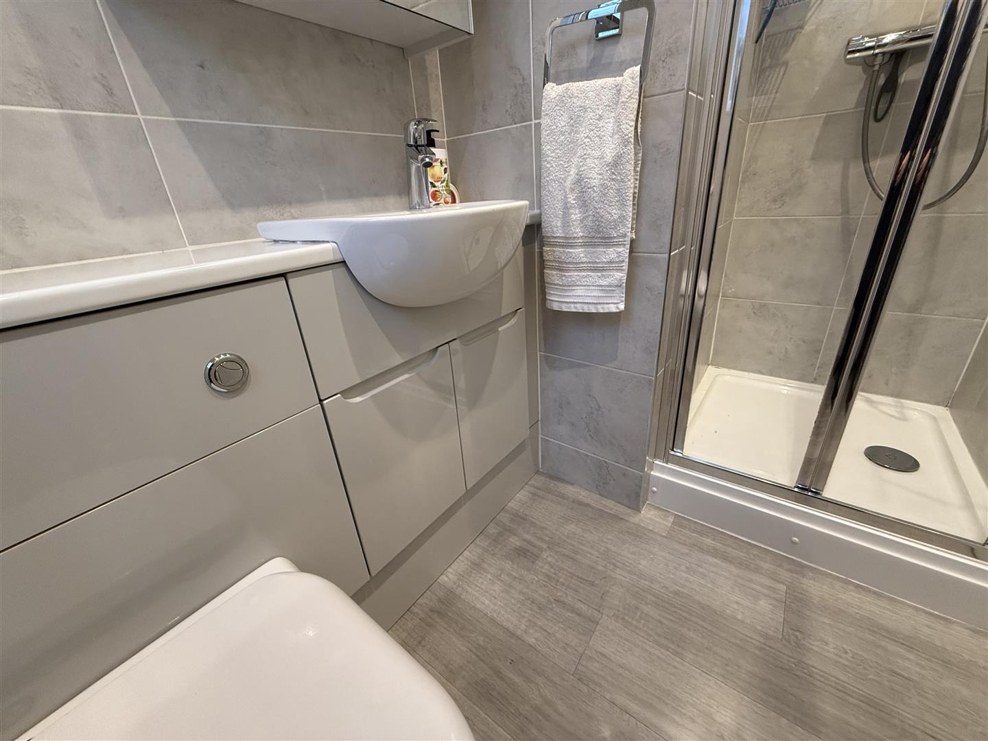 Comprising a white suite with tasteful grey vanity cabinets and finish. There is a single shower and low level WC.