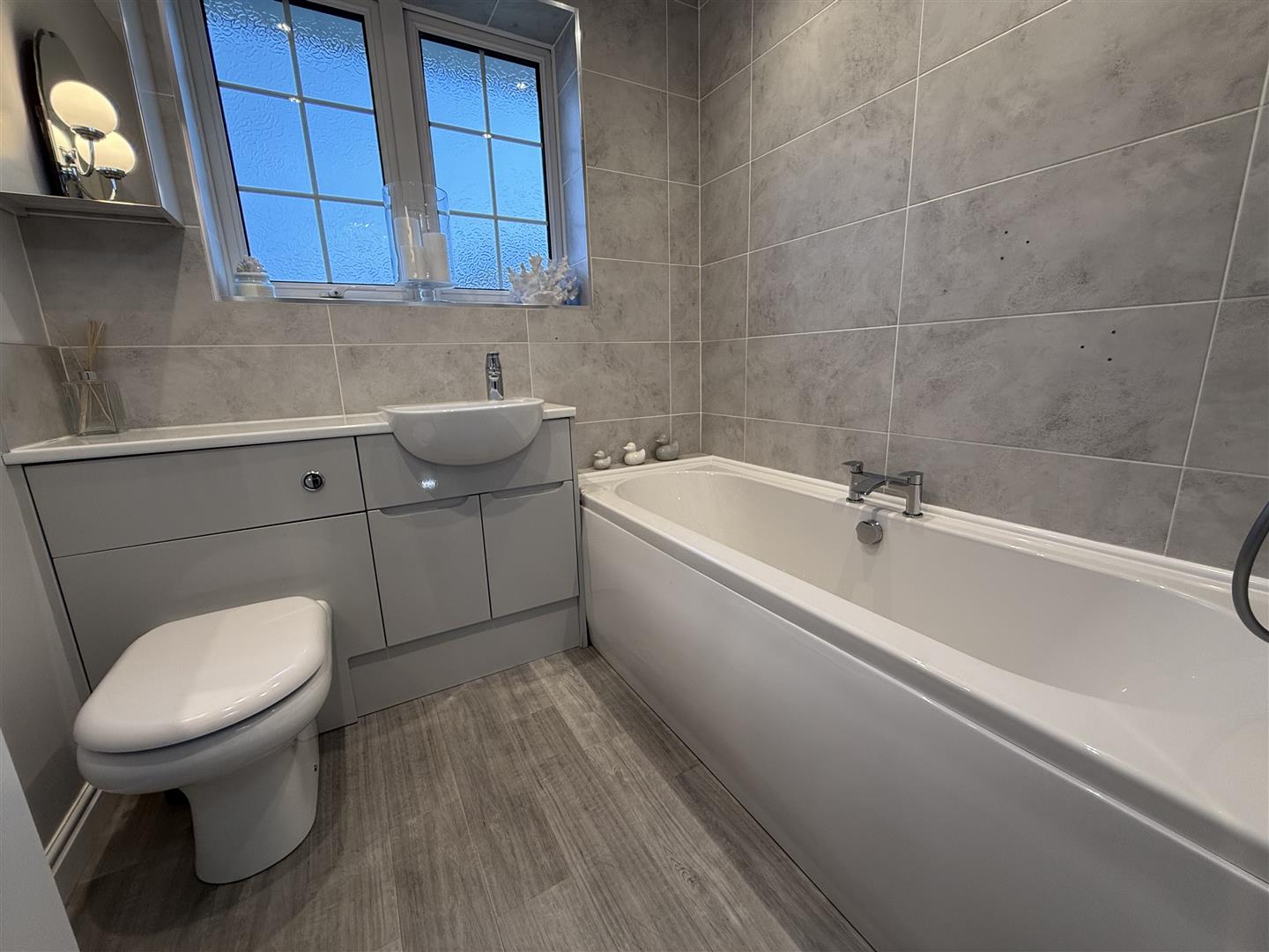 Upgraded and refitted with a modern white suite which comprises of a bath, handbasin in built in a vanity storage cabinet and low level WC. There is a window to the rear and is finished with an easy maintained wall panelling.
