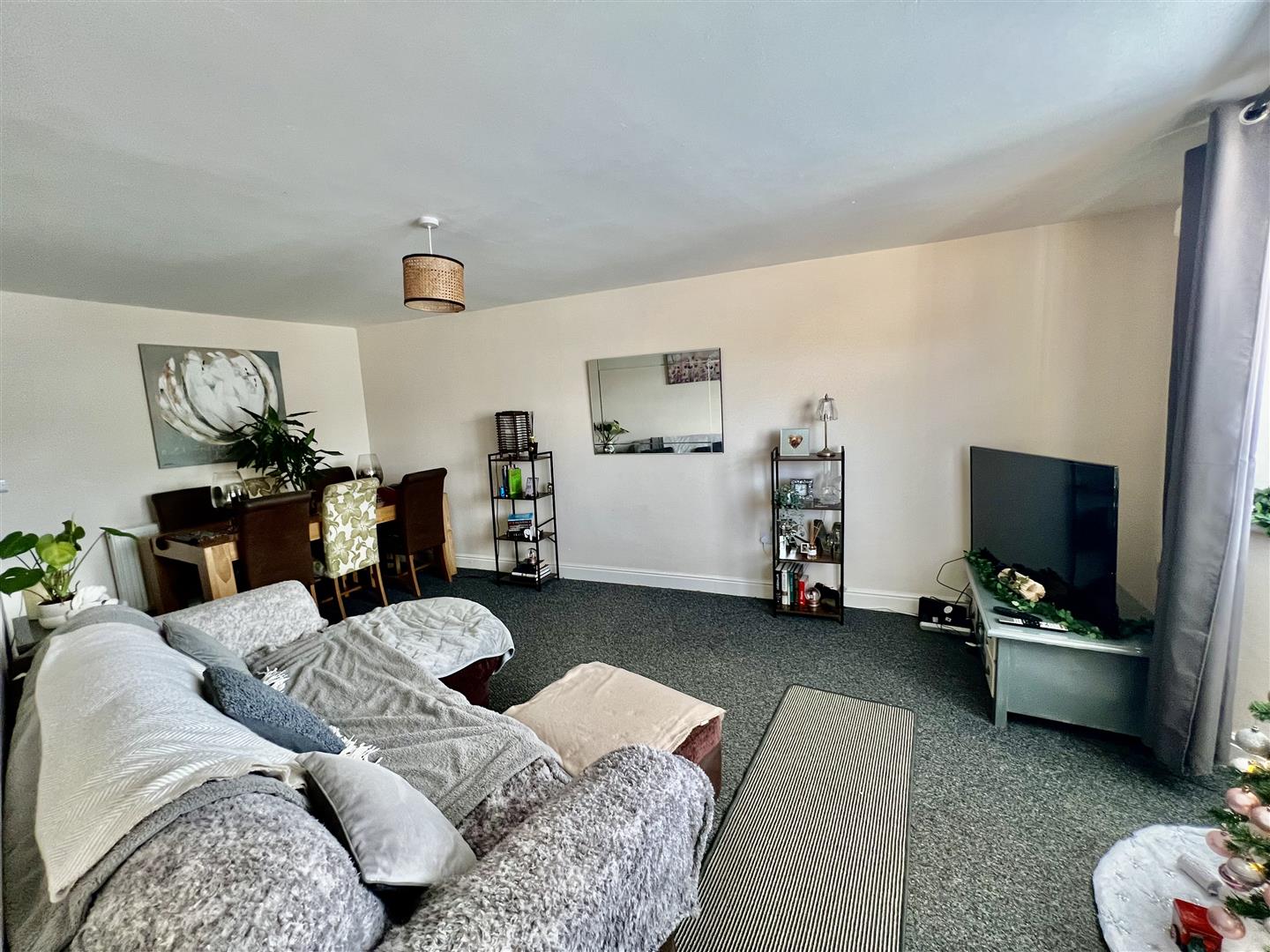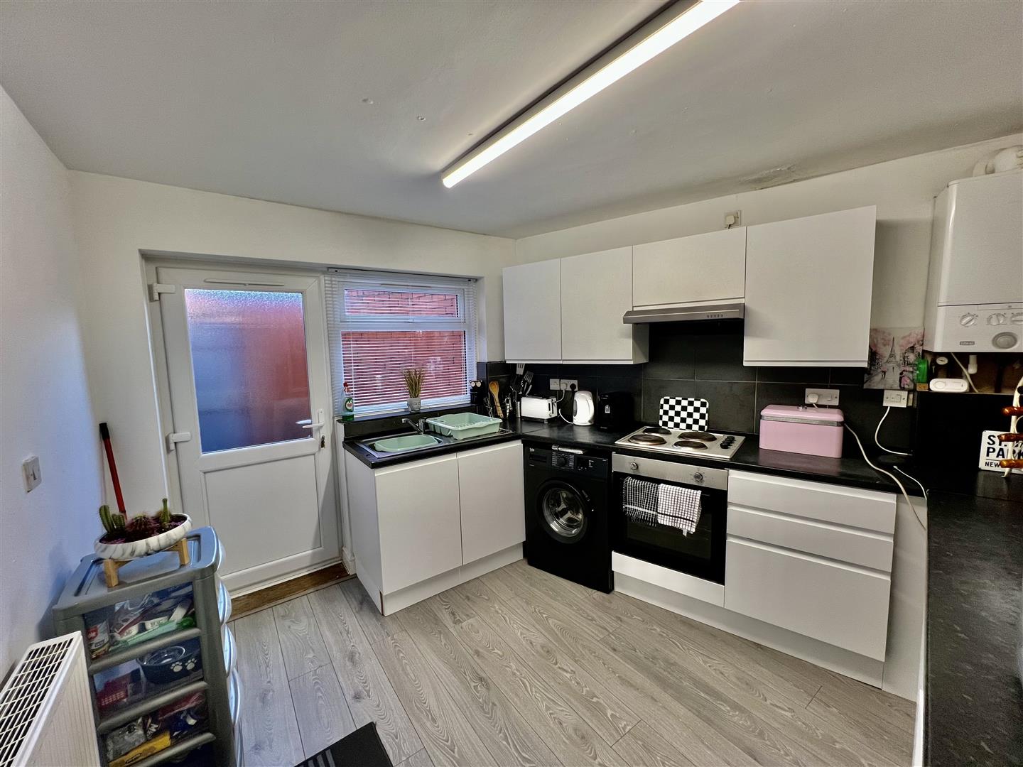 Inside, the neutral décor and practical layout suit long-term tenants. The entrance hall leads to a front living room with a bay window and a rear kitchen fitted with modern units and direct access to the low-maintenance yard.