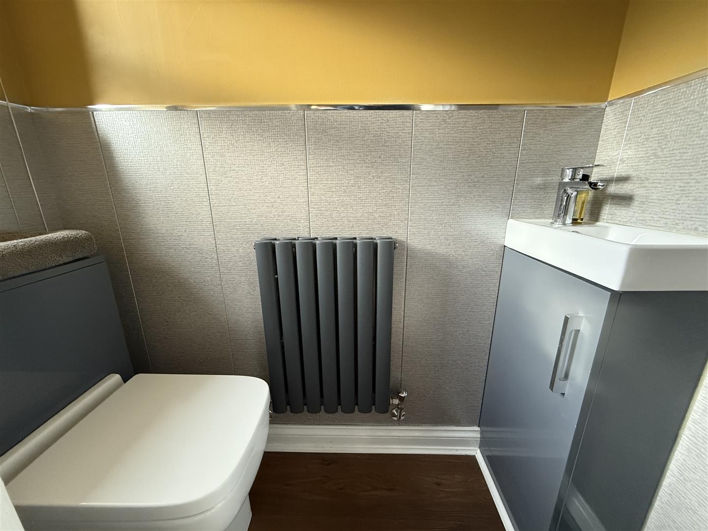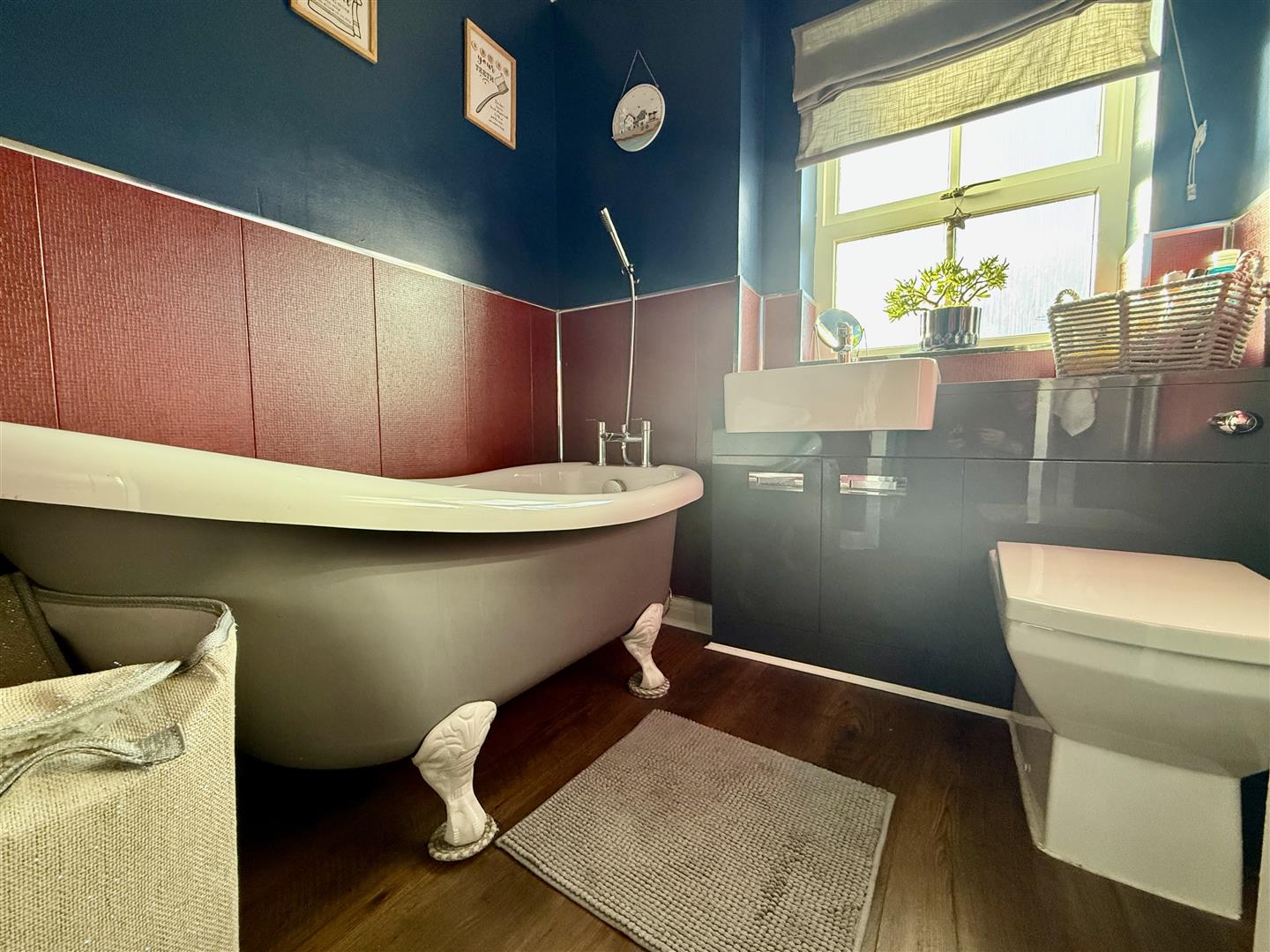 With a statement, free standing bath, WC and handbasin positioned within vanity storage cabinet. The bathroom has also been upgraded and finished with stylish and modern tones.