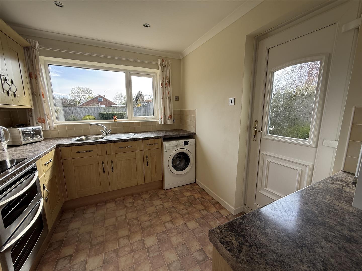 Fitted with a range of light oak effect cabinets with complementing worksurfaces with stainless steel sink unit. The integrated appliances include an electric oven and gas hob. There is a plumbing for an automatic washing machine and the room hasa tiled floor a window to the side and a door opening to the garden.