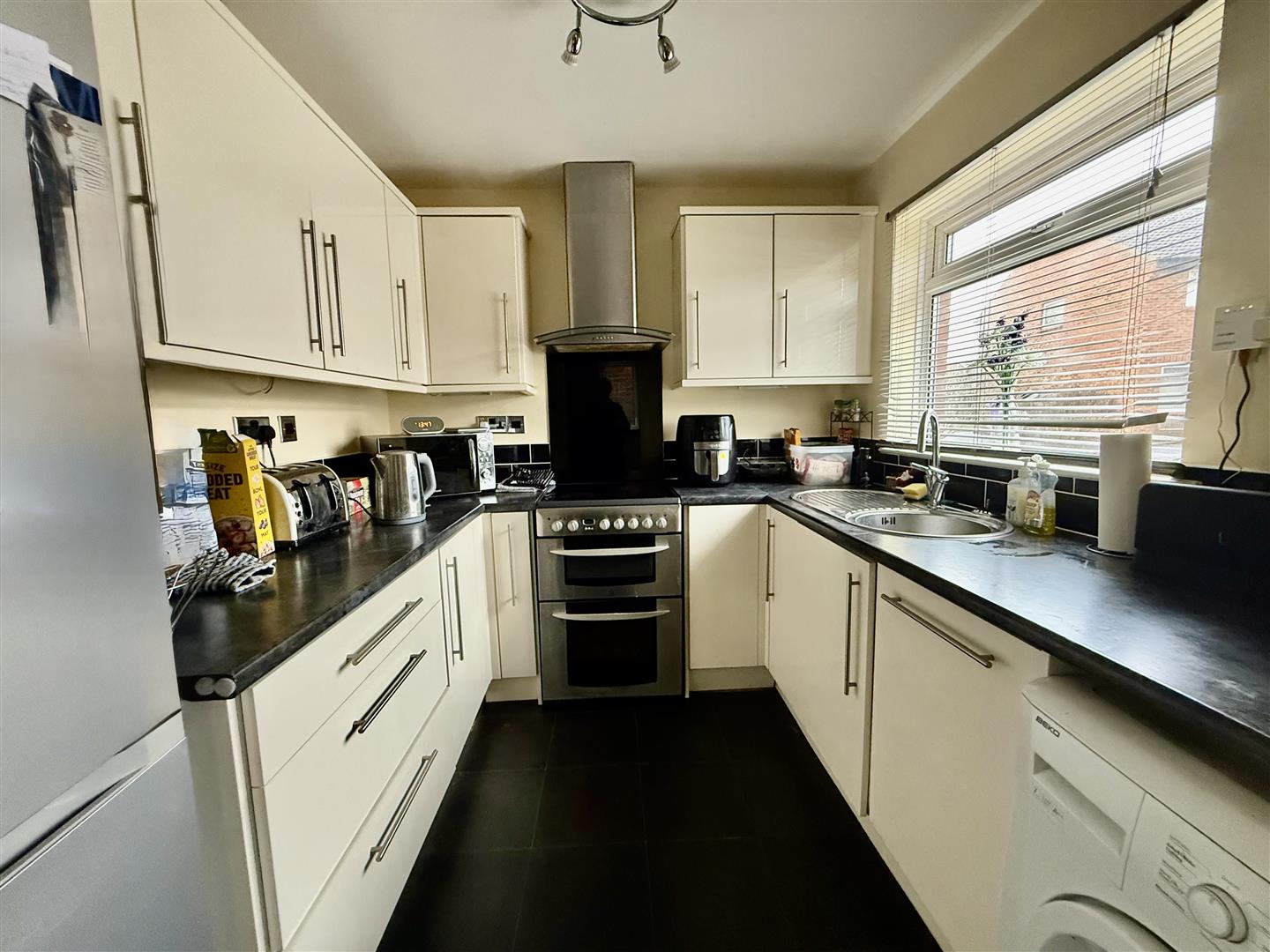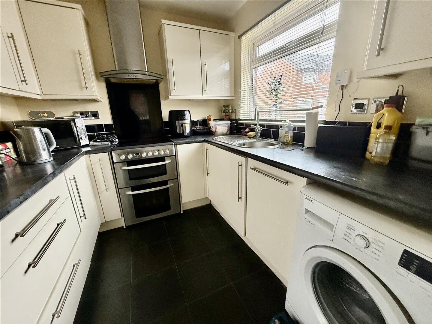 Fitted with an ample range of cream cabinets complemented by the constrasting black work surfaces with stainless steel sink unit. The free standing cooker is included in the sale and there is plumbing for an automatic washing machine.