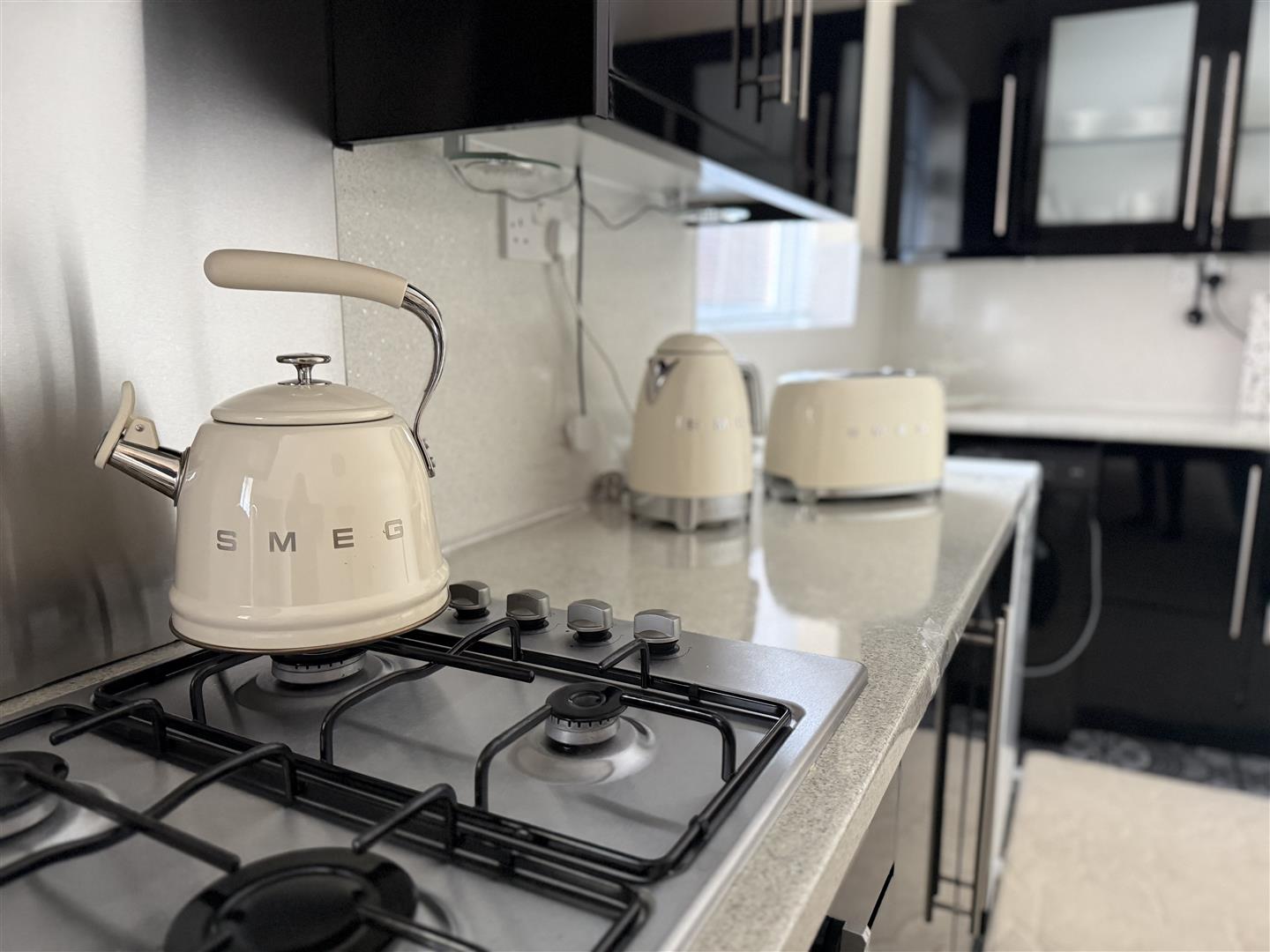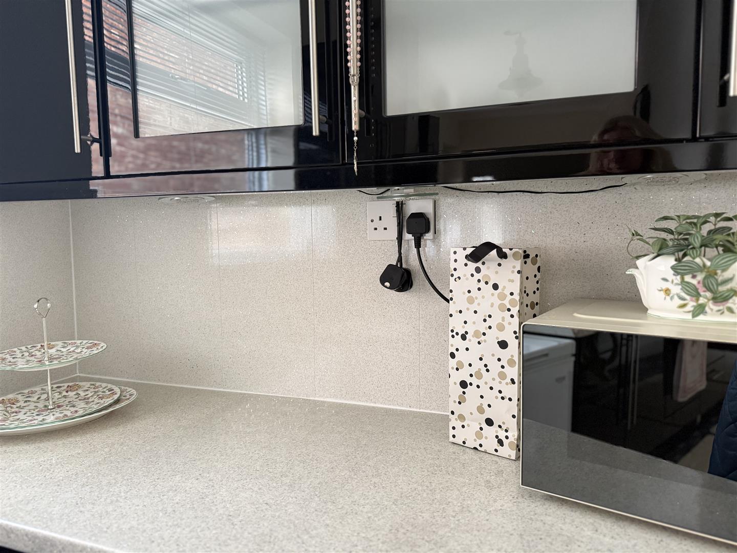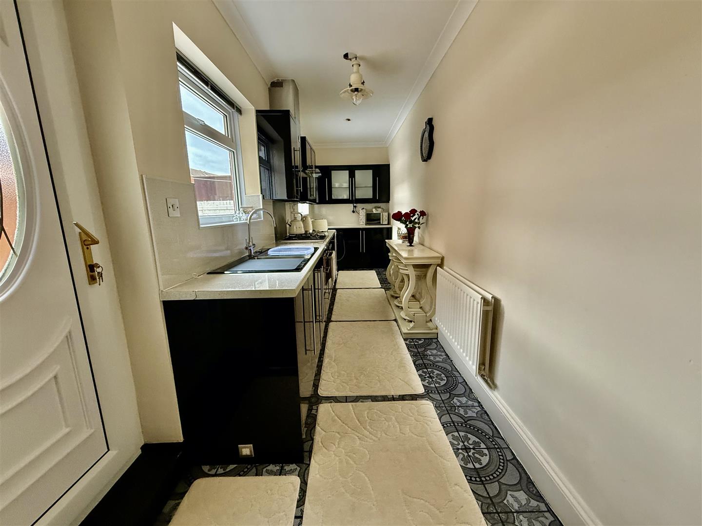 Fitted with an ample range of quality gloss cabinets which are complemented by contrasting worksurfaces with a textured sink. The integrated appliances includes an electric oven, gas hob, under counter fridge and washing machine. The room has a window to the side and door opening to the side.