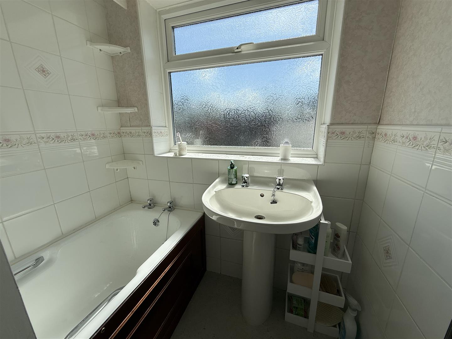 with a white panelled bath with an over the bath electric shower and also a pedestal handbasin