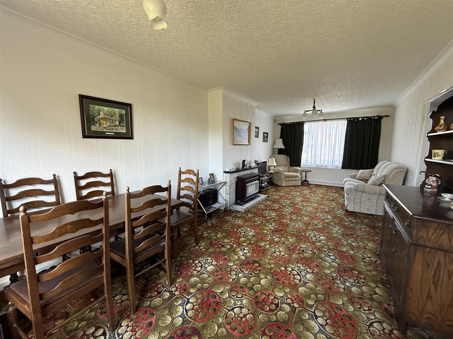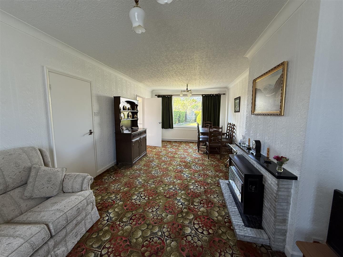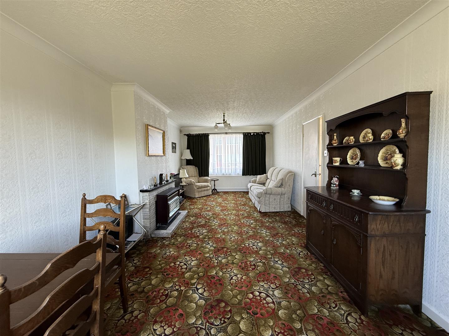 Open plan reception and dining area, spacious, light an bright being dual aspect with windows to the front and rear. There is a wall mounted gas fire.