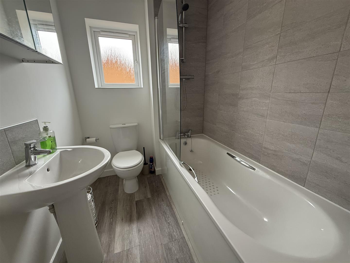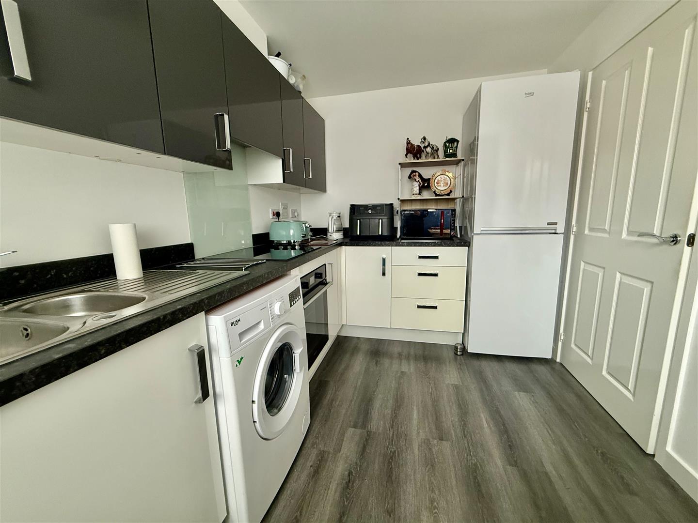 Fitted with a range of white gloss cabinets with complementing grey worksurfaces. There is an integrated electric oven and electric hob and plumbing for an automatic washing machine. The room has a window to the front aspect and there is space for a breakfast table.