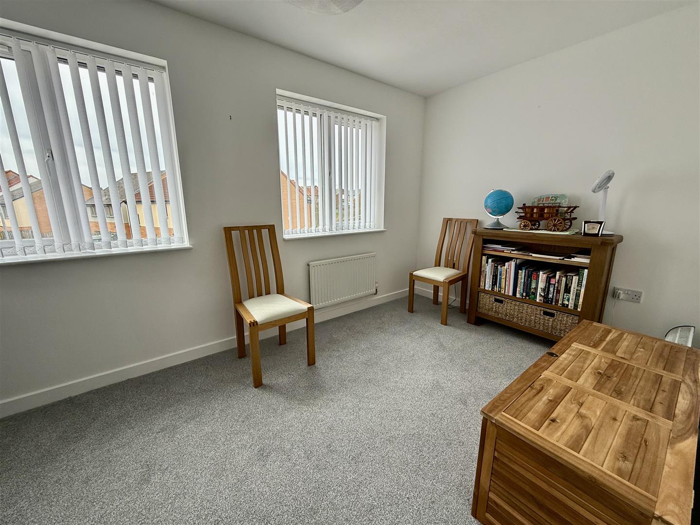 A second double bedroom with two windows to the front aspect and having a built in over the stairs cupboard.